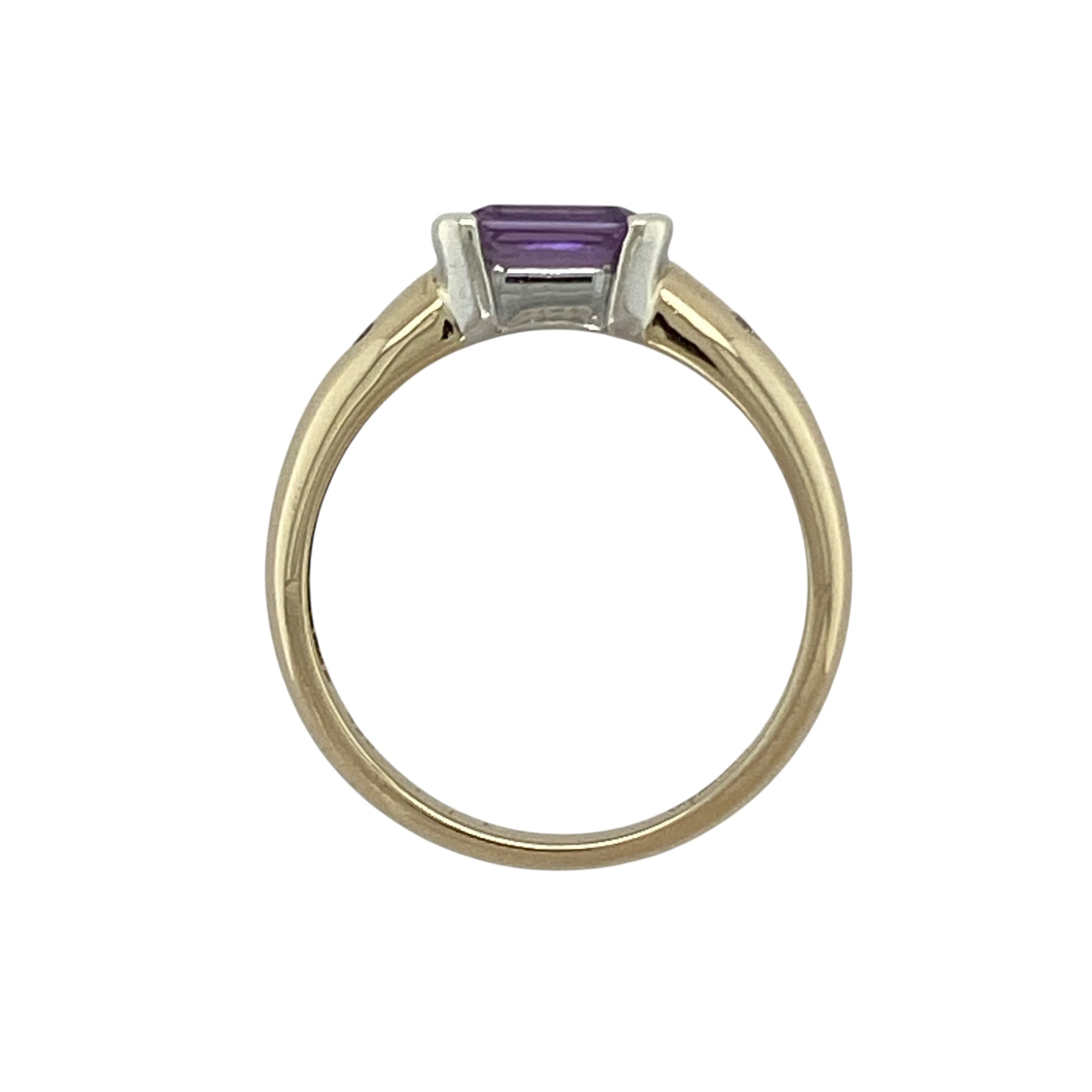 Design: The ring features a 5mm by 7mm rectangular amethyst at the centre, accented with diamonds that enhance its deep purple hue.
