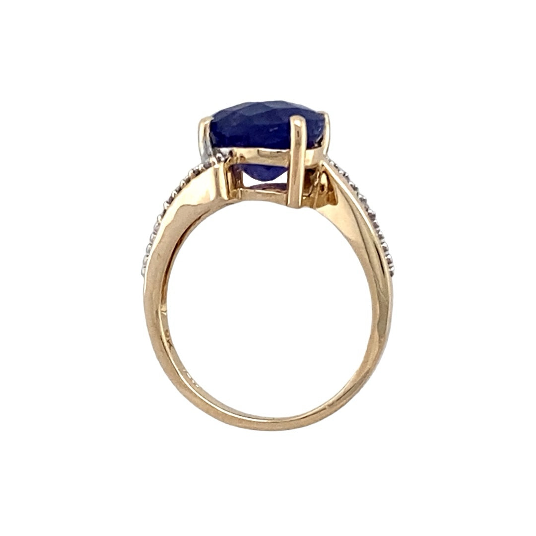 Preowned 9ct Yellow and White Gold Diamond & Blue Stone Wrap Around Ring in size J with the weight 2.60 grams. The blue stone is 9mm by 7mm