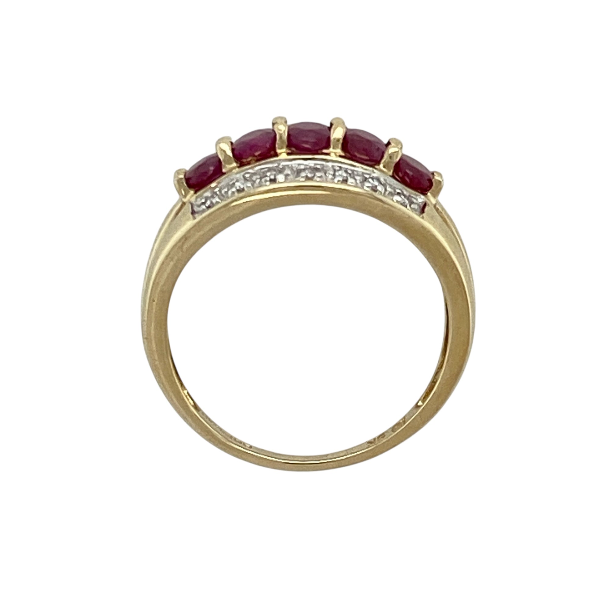 Design: The ring features a 10mm wide front set with five oval rubies, each measuring 4mm by 3mm, interspersed with diamonds for a balanced and eye-catching look.