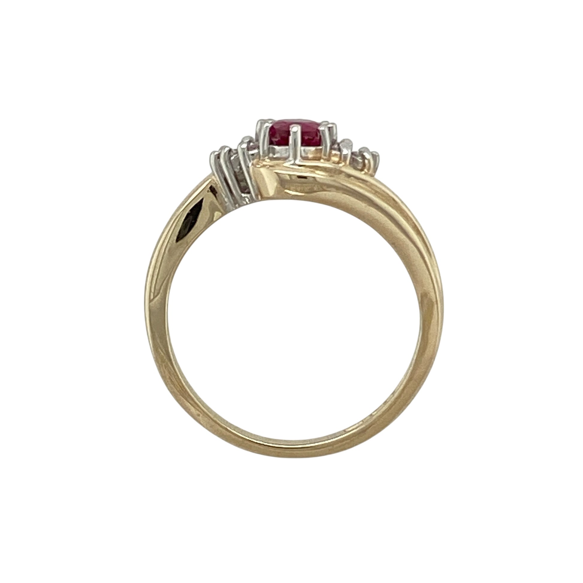 Add rich colour and sparkle to your collection with this pre-owned 9ct yellow gold ruby and diamond cluster twist ring, a timeless design with elegant detail.