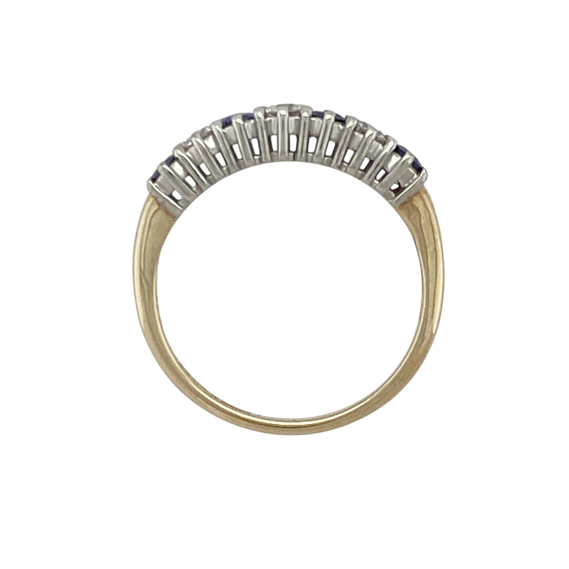 Bring classic elegance and vibrant colour to your collection with this pre-owned 9ct yellow gold sapphire and diamond band ring, offering timeless style with a touch of sparkle—perfect for everyday wear or special occasions.