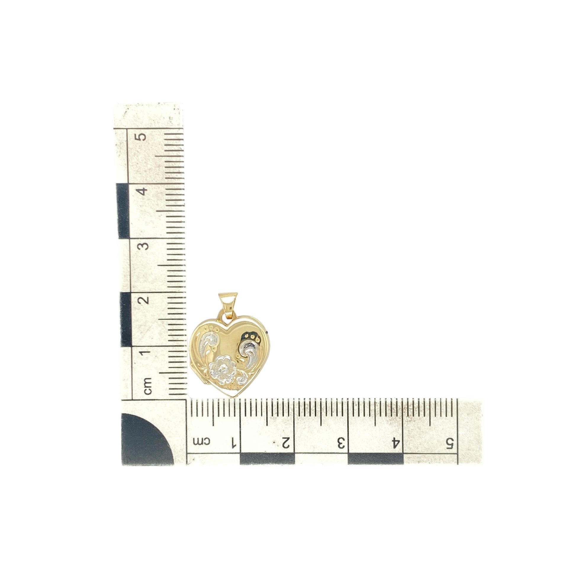 Pre-owned 9ct Yellow and White Gold Flower Patterned Heart Locket with the weight 1.20 grams and the bail is 4mm by 3mm