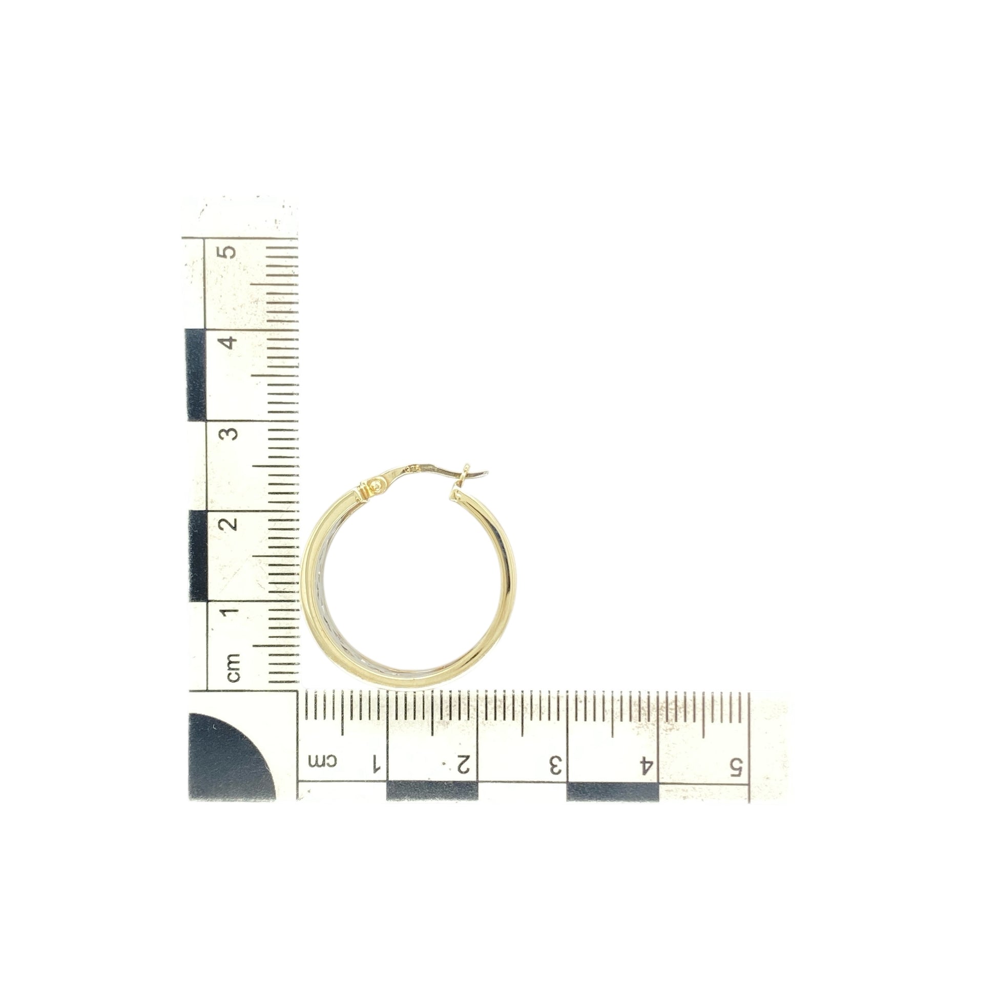 Design: Each earring features an open weave hoop pattern, blending yellow and white gold for a textured and eye-catching look.