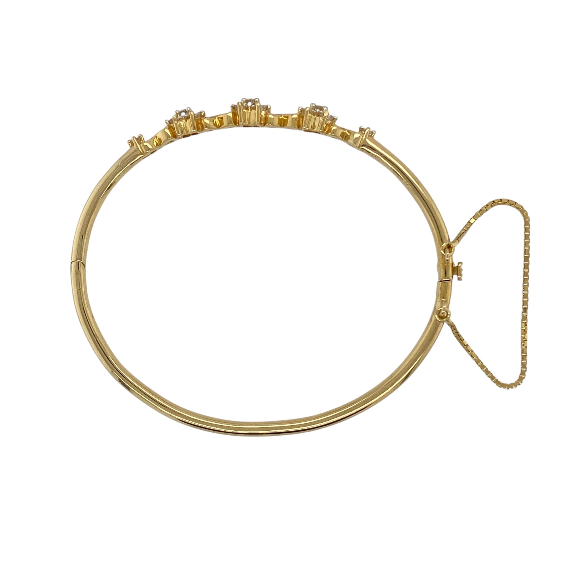 Design: The bangle features a central flower cluster motif adorned with diamonds, adding brilliance and a touch of vintage-inspired charm. A fitted safety chain provides extra security while wearing.