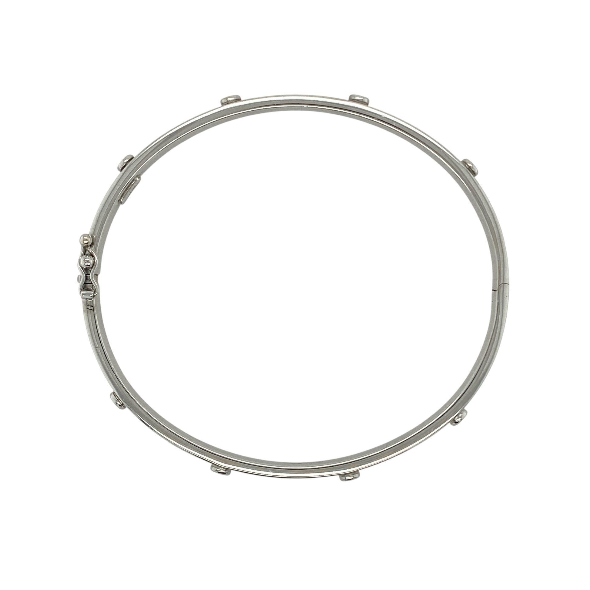 Design: The bangle measures 4mm wide with a 6cm diameter and is set with eight diamonds across the front for subtle brilliance.