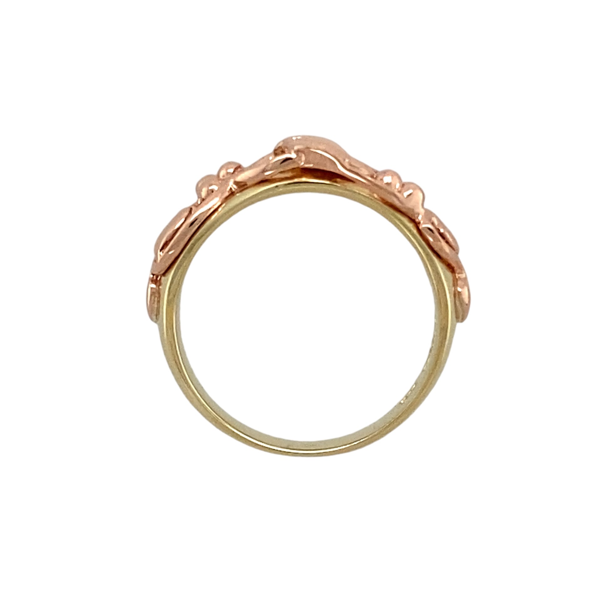 Preowned 9ct Yellow and Rose Gold Clogau Tree of Life Ring in size P with the weight 4.60 grams. The front of the ring is 9mm high