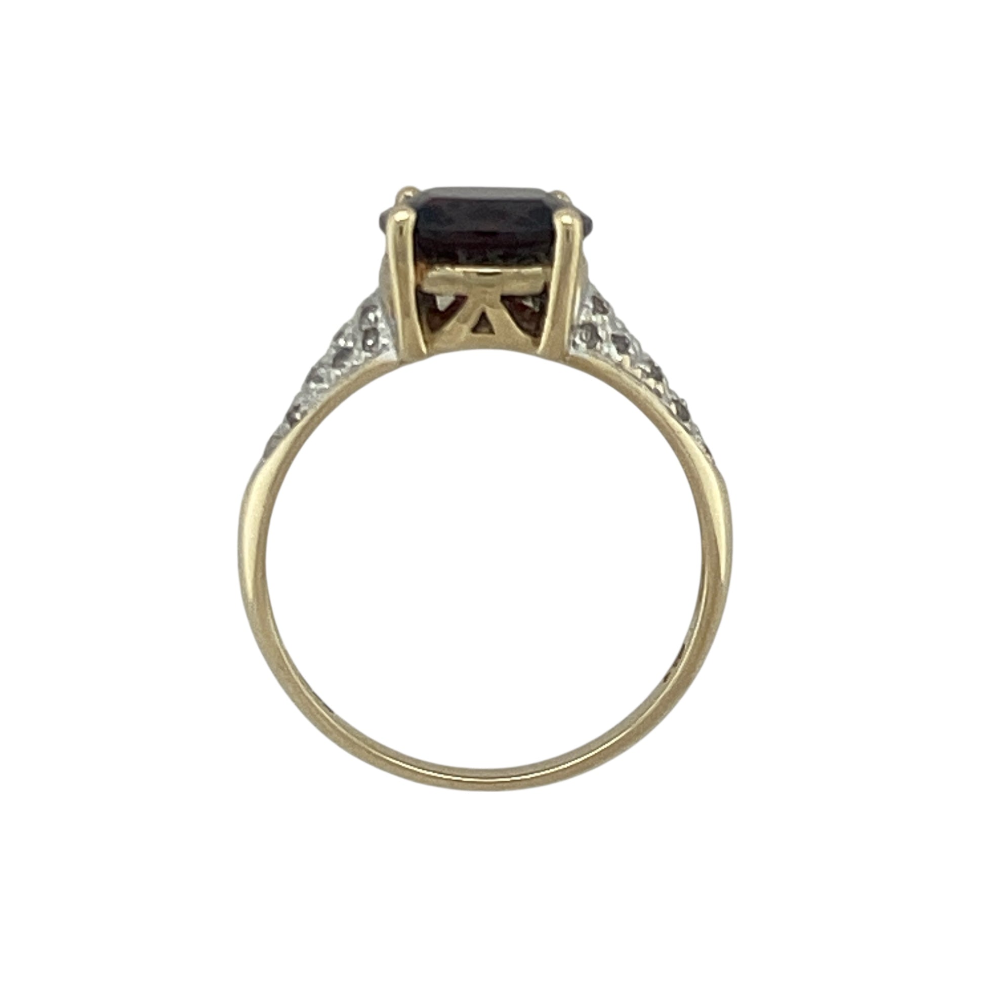 Bring rich colour and elegant sparkle to your collection with this pre-owned 9ct yellow and white gold garnet and diamond ring—an attractive piece offering timeless beauty and refined contrast.