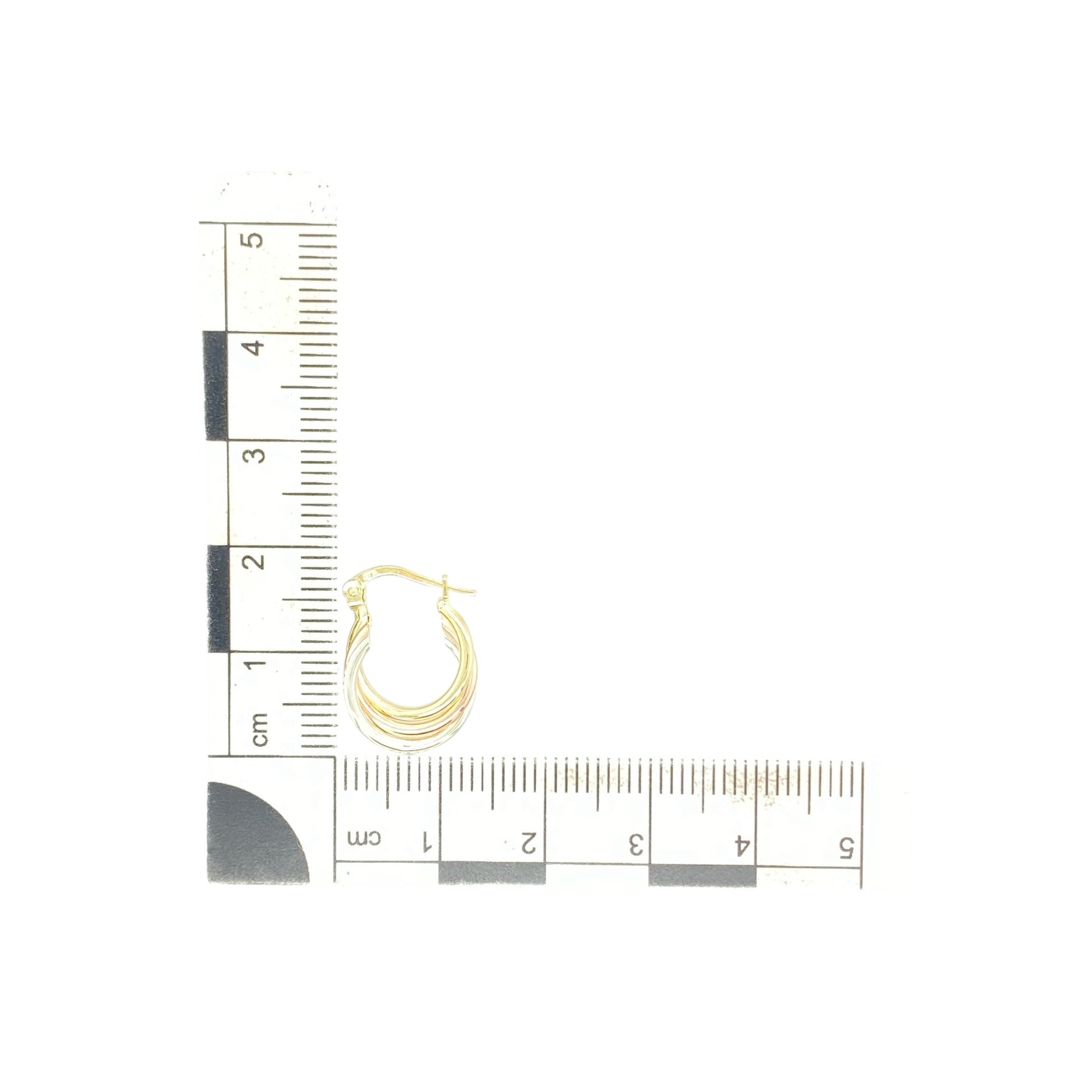 A versatile pair of tri-colour gold hoop earrings—perfect for those searching for twist creole earrings, multi-tone gold hoops or classic yet contemporary gold jewellery.