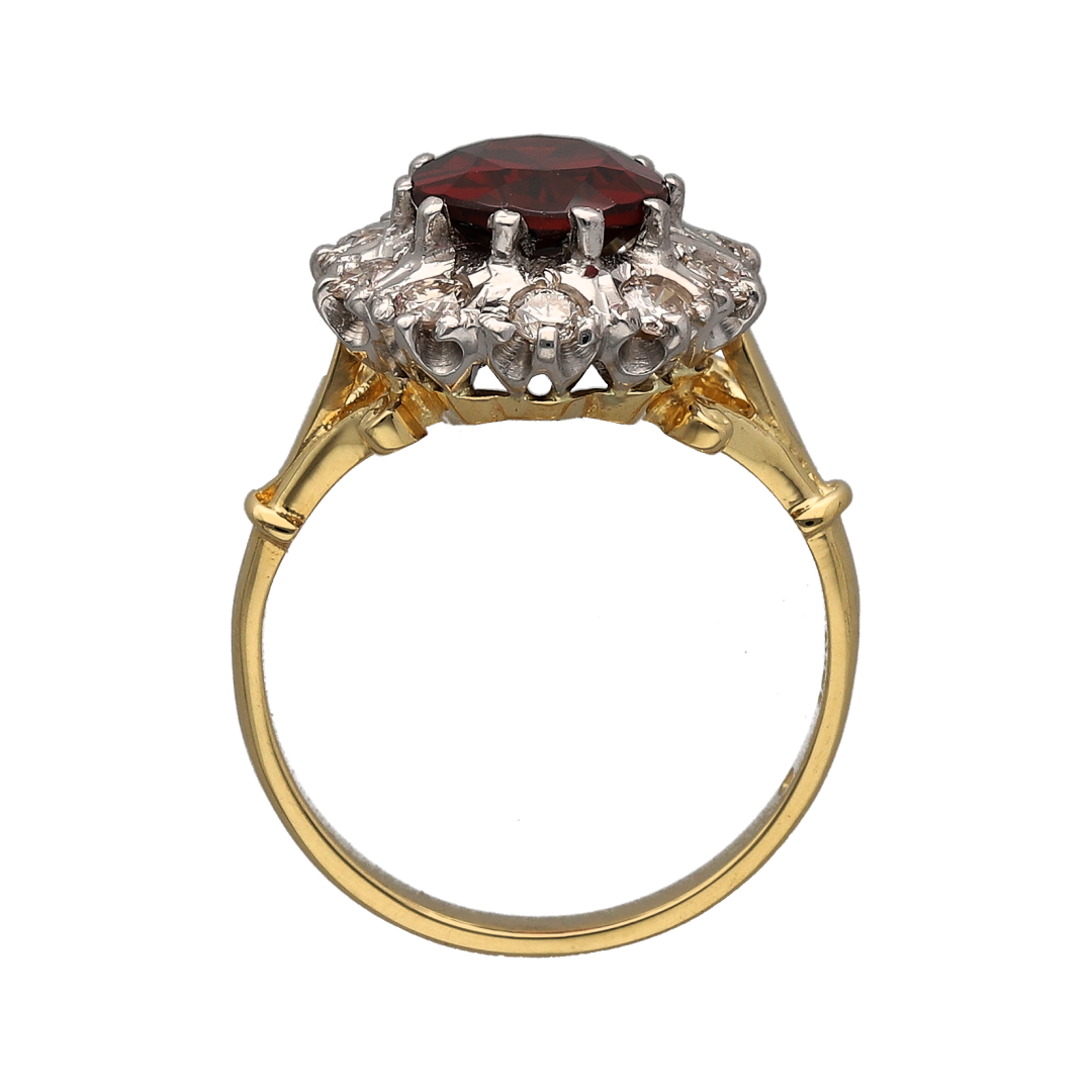 Design: The ring features a 10mm by 8mm oval garnet at the centre, surrounded by a sparkling halo of diamonds for a timeless cluster effect.