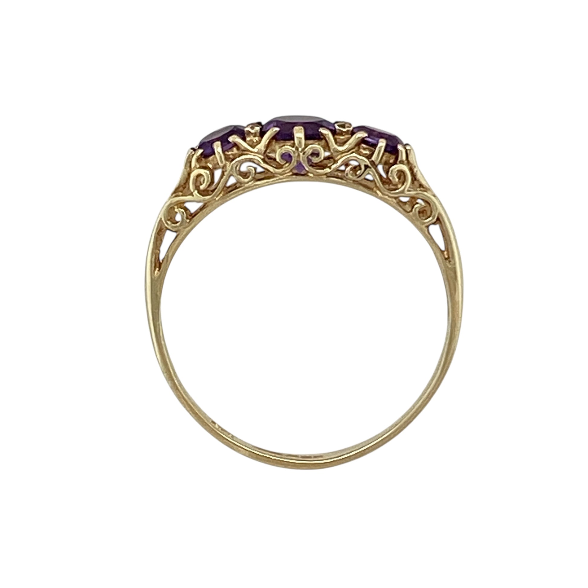 Bring gentle colour and timeless symbolism to your jewellery collection with this pre-owned 9ct yellow gold amethyst set trilogy ring, a refined design with elegant simplicity and meaningful charm.