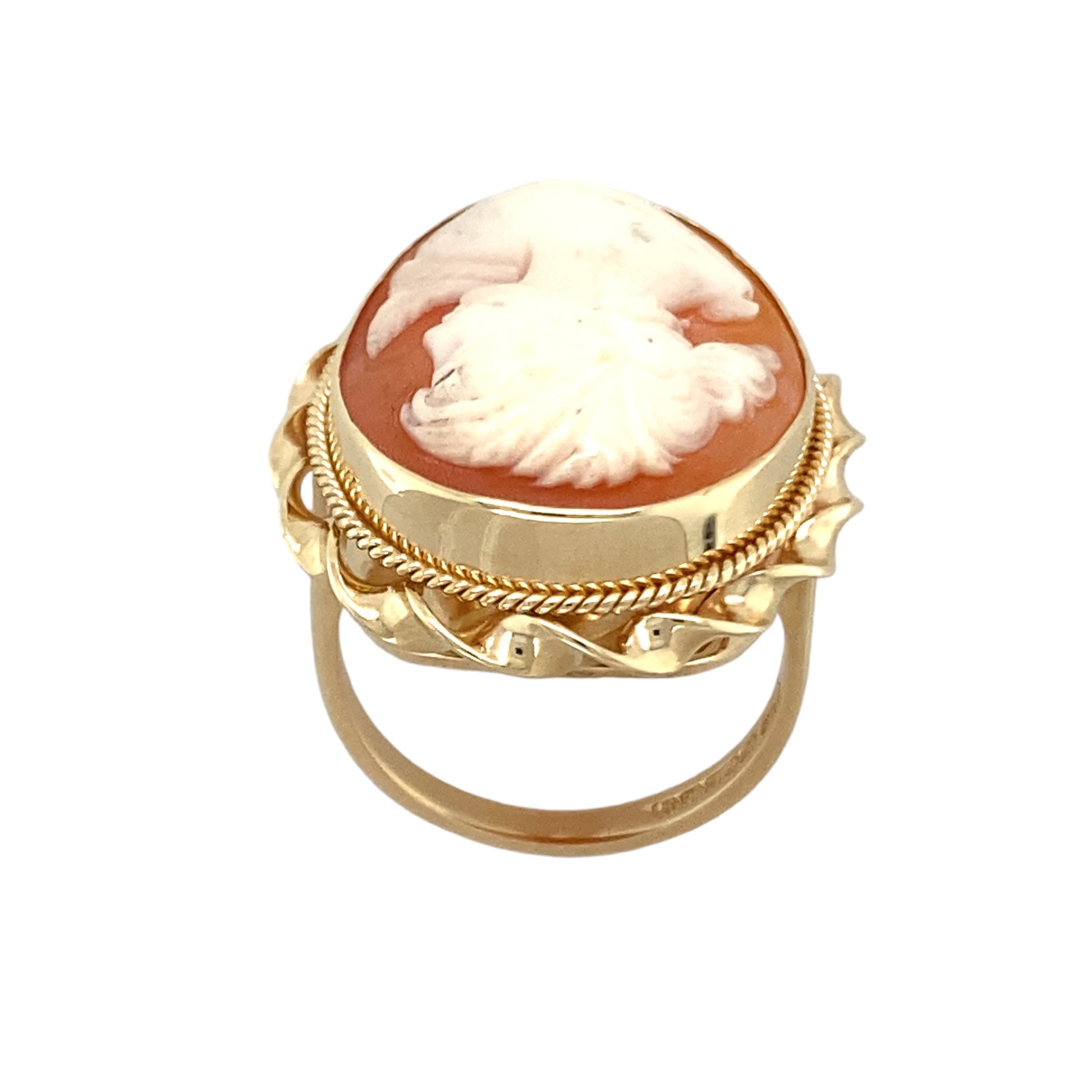 Preowned 9ct Yellow Gold & Cameo Set Large Dress Ring in size O with the weight 9.50 grams. The cameo stone is 25mm by 19mm