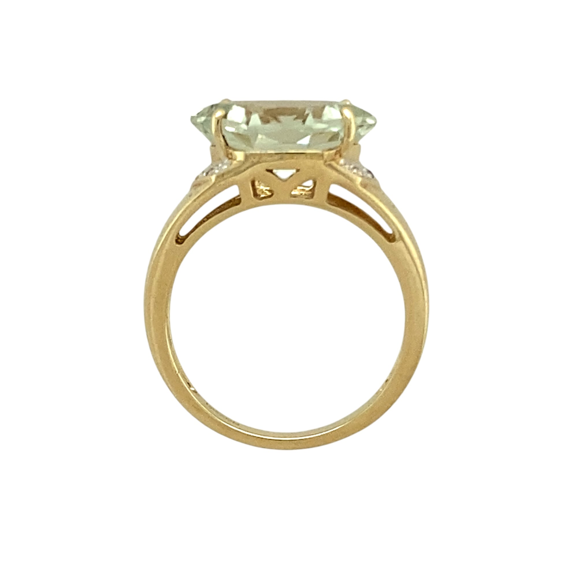 Preowned 9ct Yellow and White Gold Light Green & Cubic Zirconia Set Dress Ring in size N with the weight 4 grams. The light green/aqua coloured stone is 10mm by 13mm