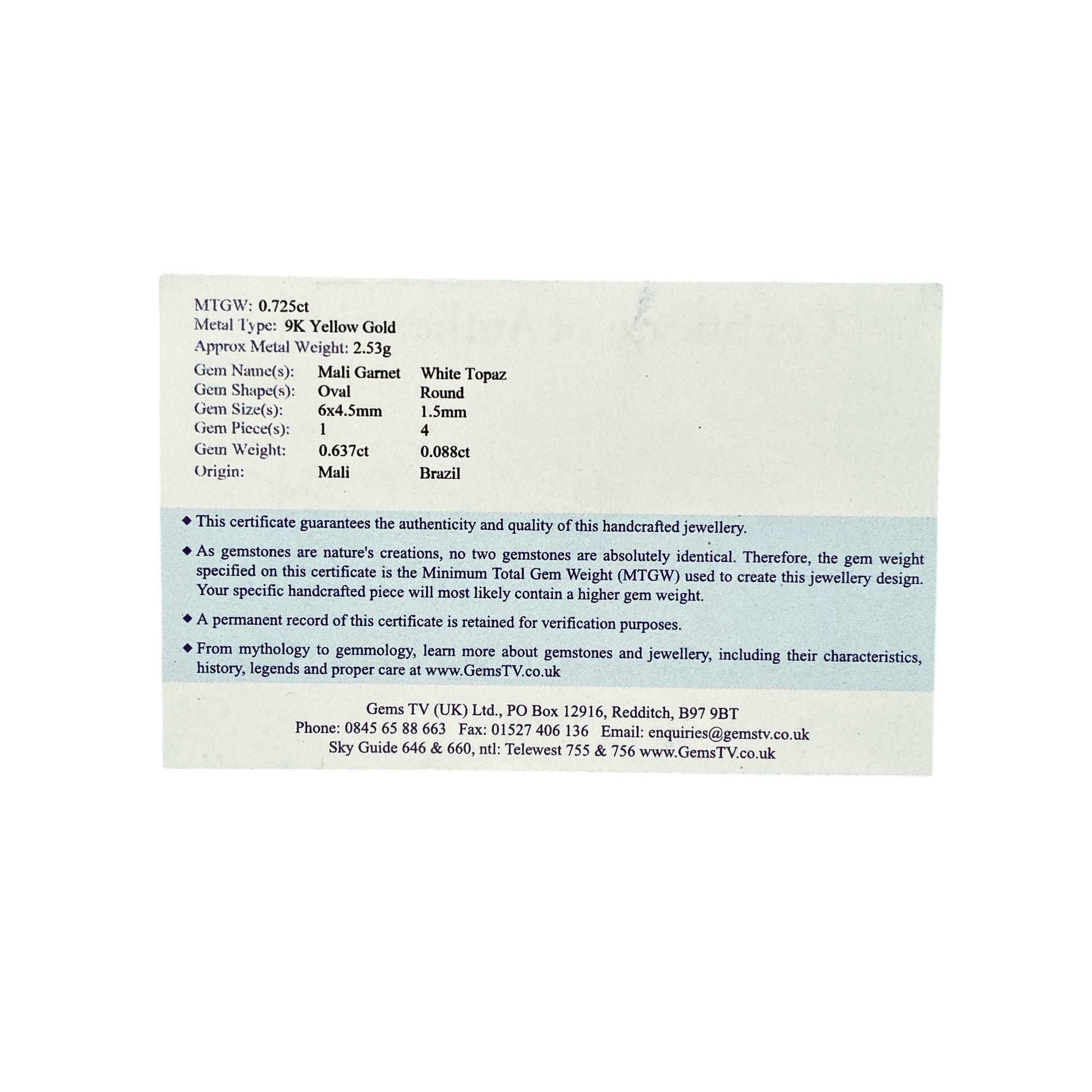 Material: Made from 9-carat yellow gold, the warm polished finish perfectly harmonises with the rich tones of the Mali garnet and the brilliance of the white topaz.