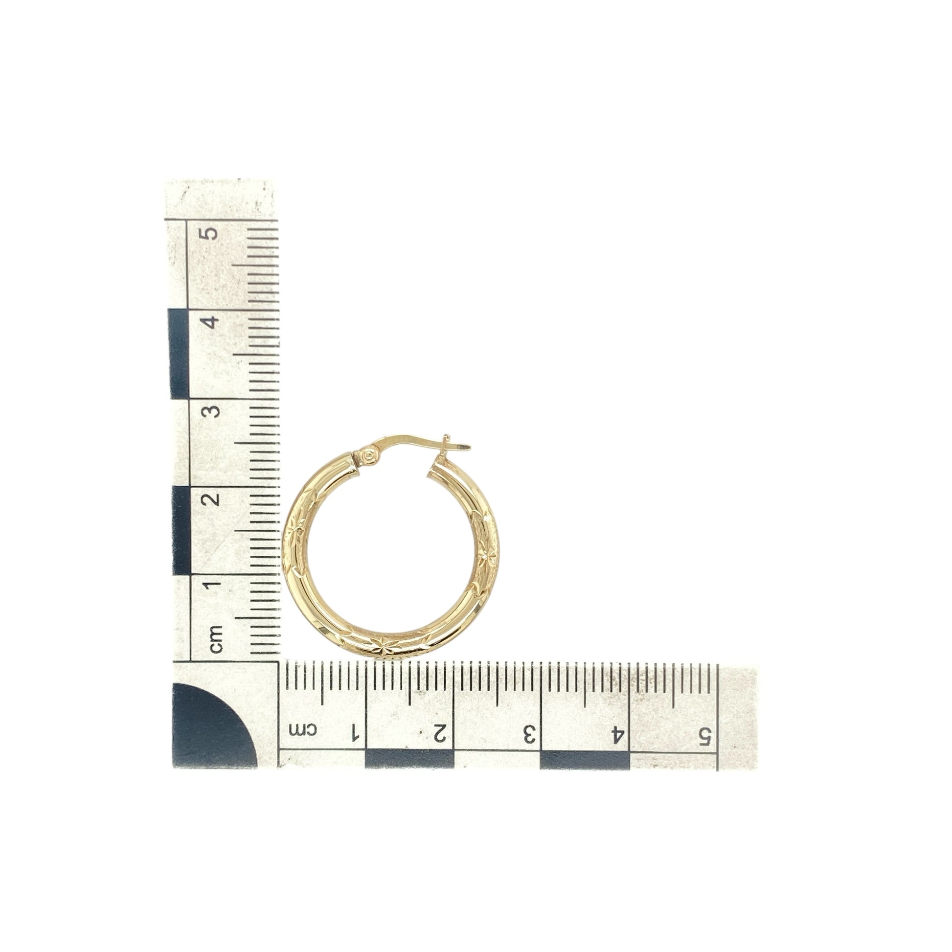 Design: Each earring features a polished hoop creole shape adorned with an intricate pattern, adding depth and visual interest while maintaining a classic silhouette.