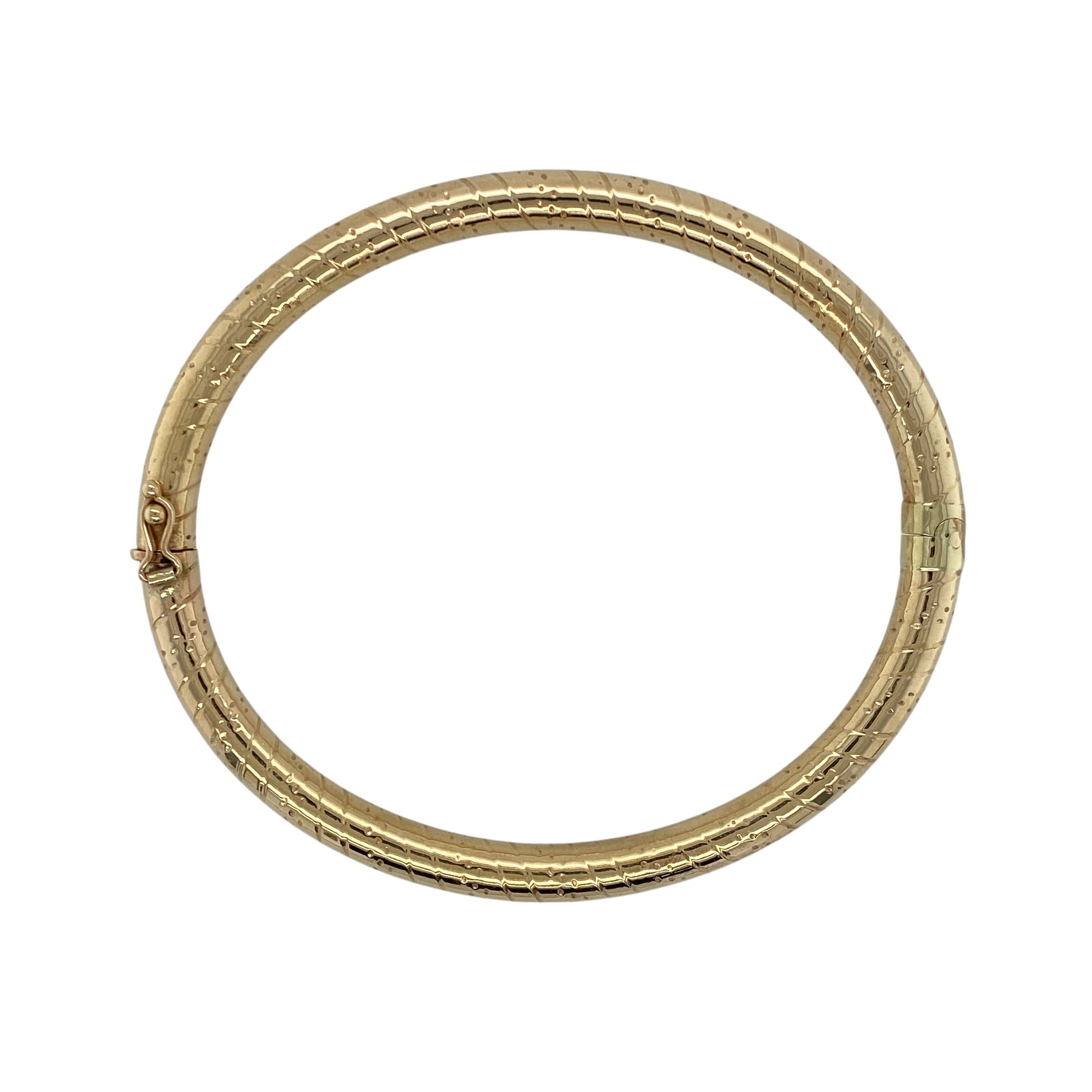 Bring bold style and golden elegance to your collection with this pre-owned 9ct yellow gold striped patterned hinged bangle—a substantial piece with timeless appeal.