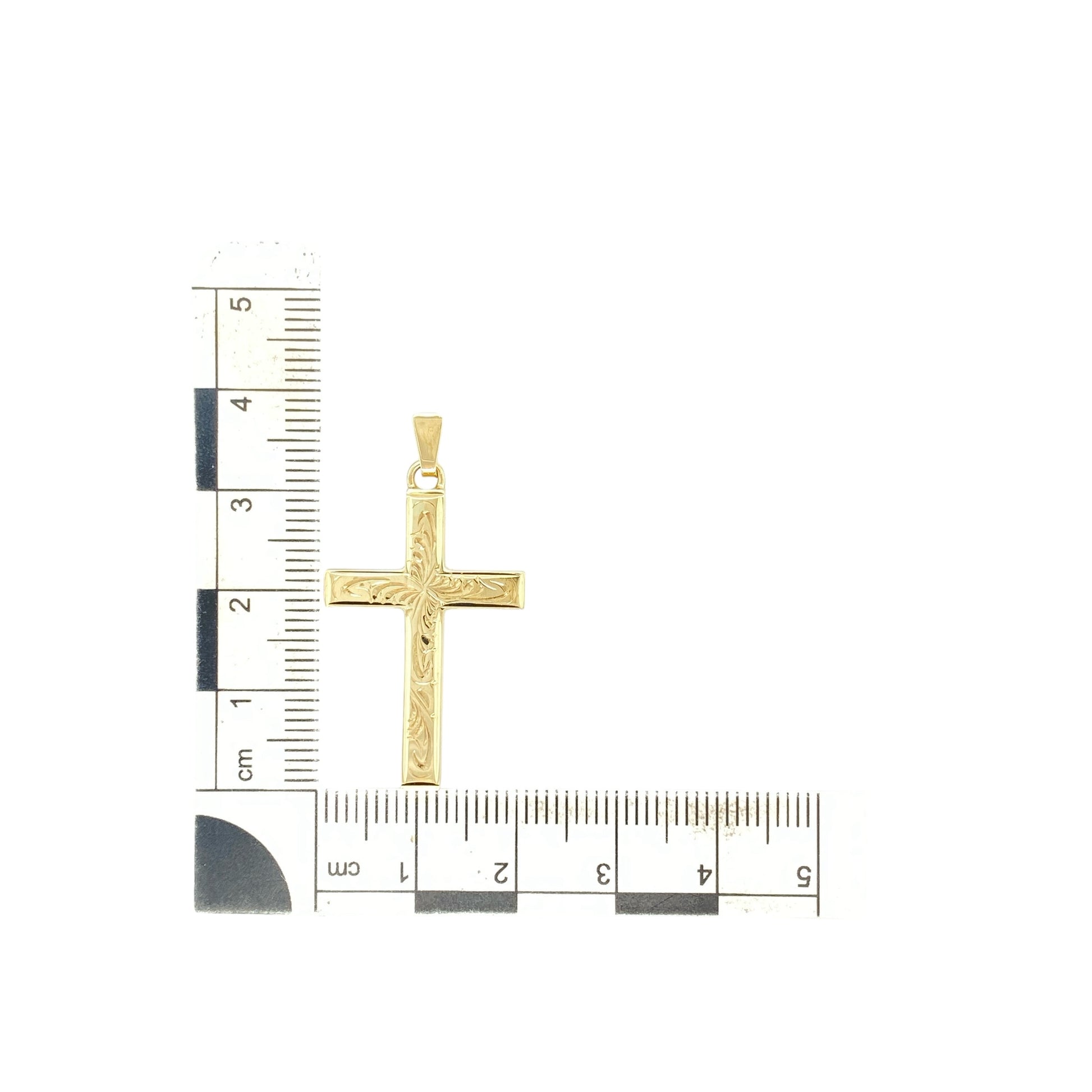 Design: The pendant features a traditional cross shape with patterned detailing throughout, adding texture and visual depth to the design.
