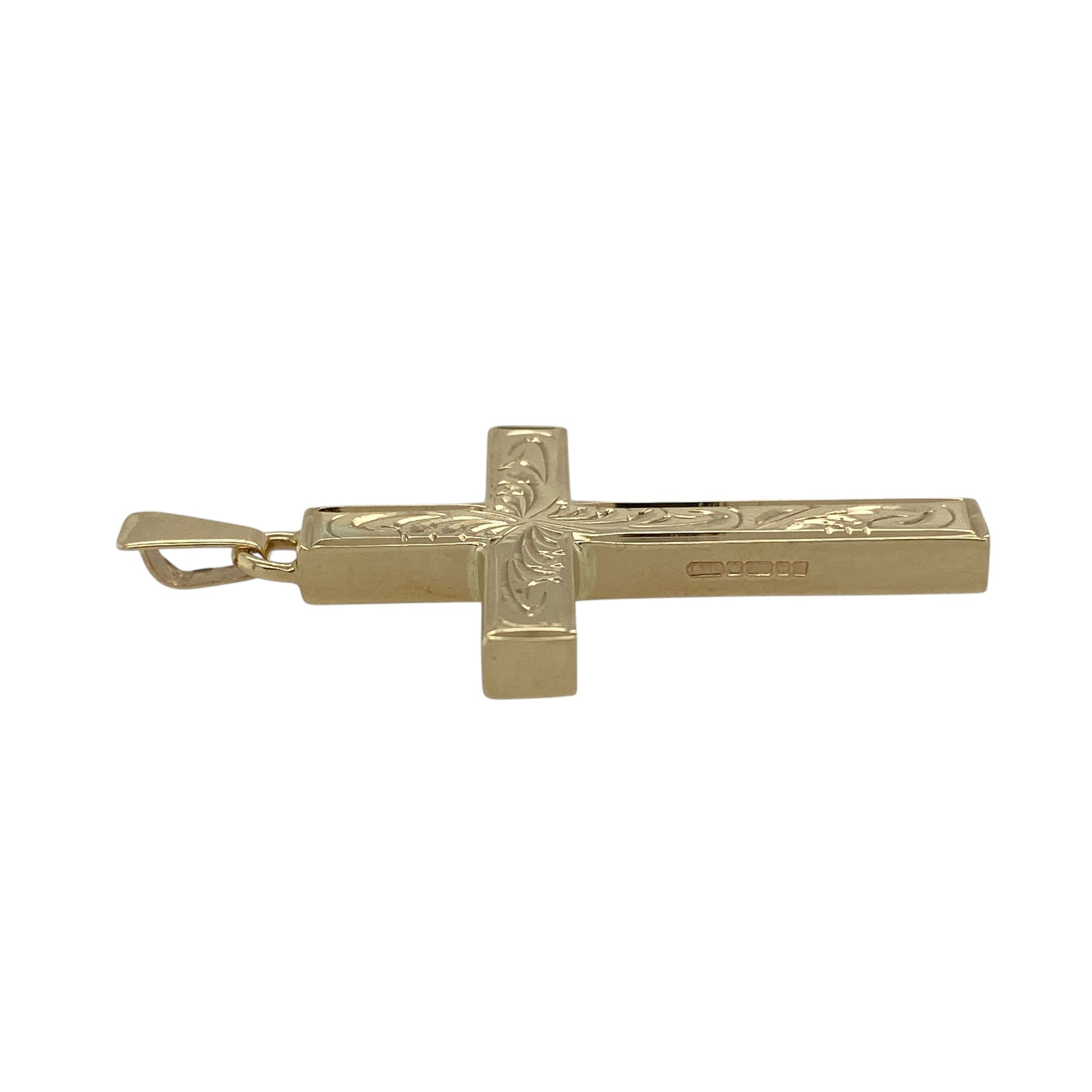 Bring bold faith-inspired style and timeless craftsmanship to your jewellery collection with this pre-owned 9ct yellow solid gold patterned cross pendant, offering strong presence and classic appeal.