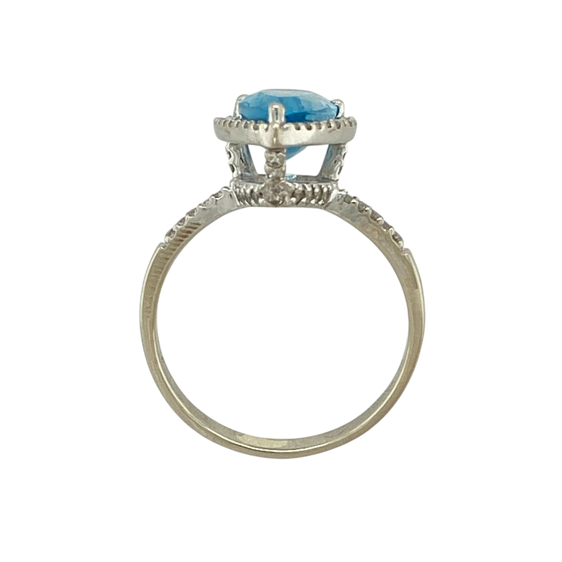 Design: The ring features a pear-shaped (teardrop) blue topaz measuring 12mm by 7mm, surrounded by a shimmering halo of diamonds, with additional diamonds continuing along the shoulders for added brilliance.