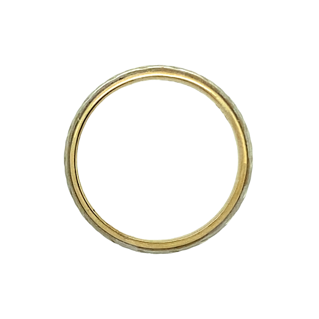 New 9ct Yellow and White Gold 4mm Patterned Band Ring in size N with the weight 2.40 grams. The white Gold band moves independently from the yellow Gold in a spinning movement