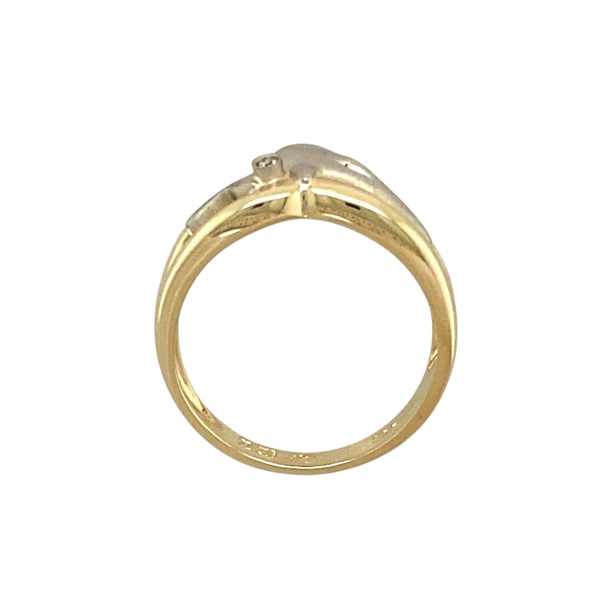 Preowned 14ct Yellow and White Gold & Diamond Set Dolphin Ring in size N with the weight 3.60 grams. The front of the ring is 11mm high