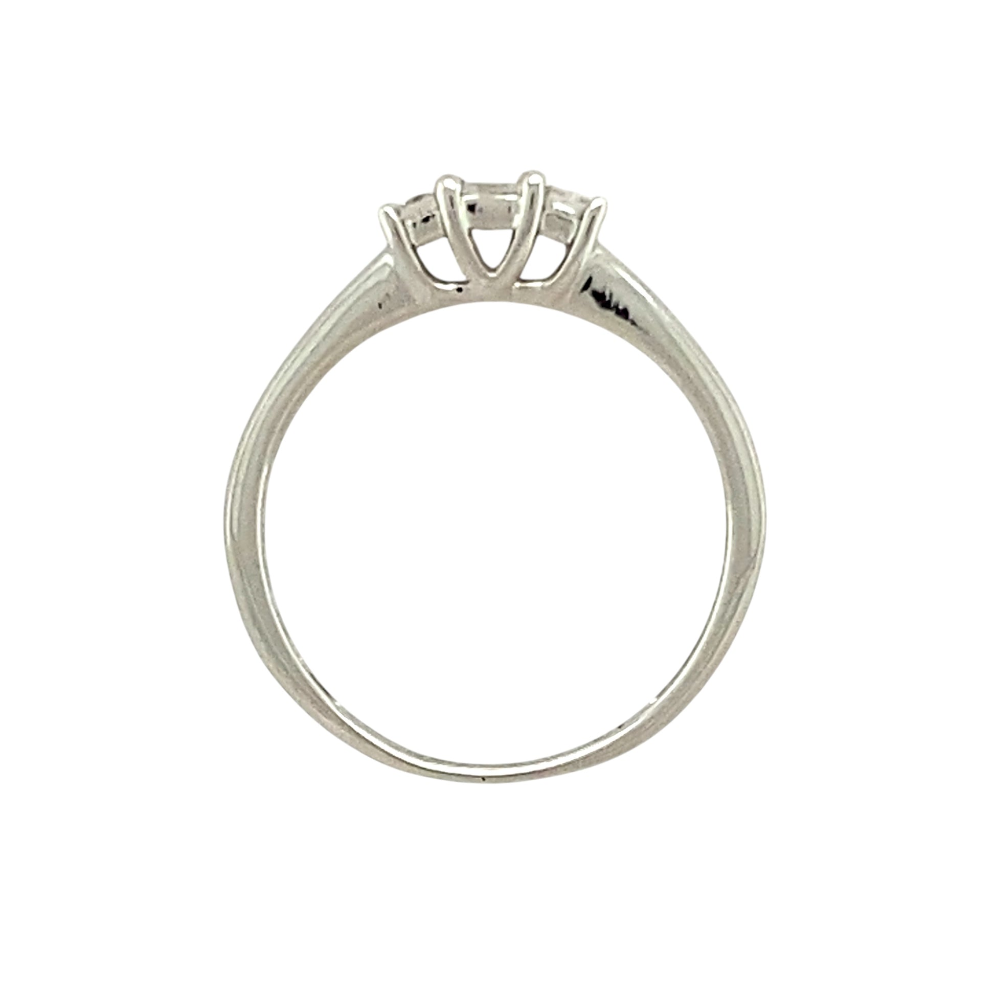 Preowned 14ct White Gold & Diamond Set Princess Cut Trilogy Ring in size M with the weight 1.80 grams. There is approximately 0.25ct of diamond content in total