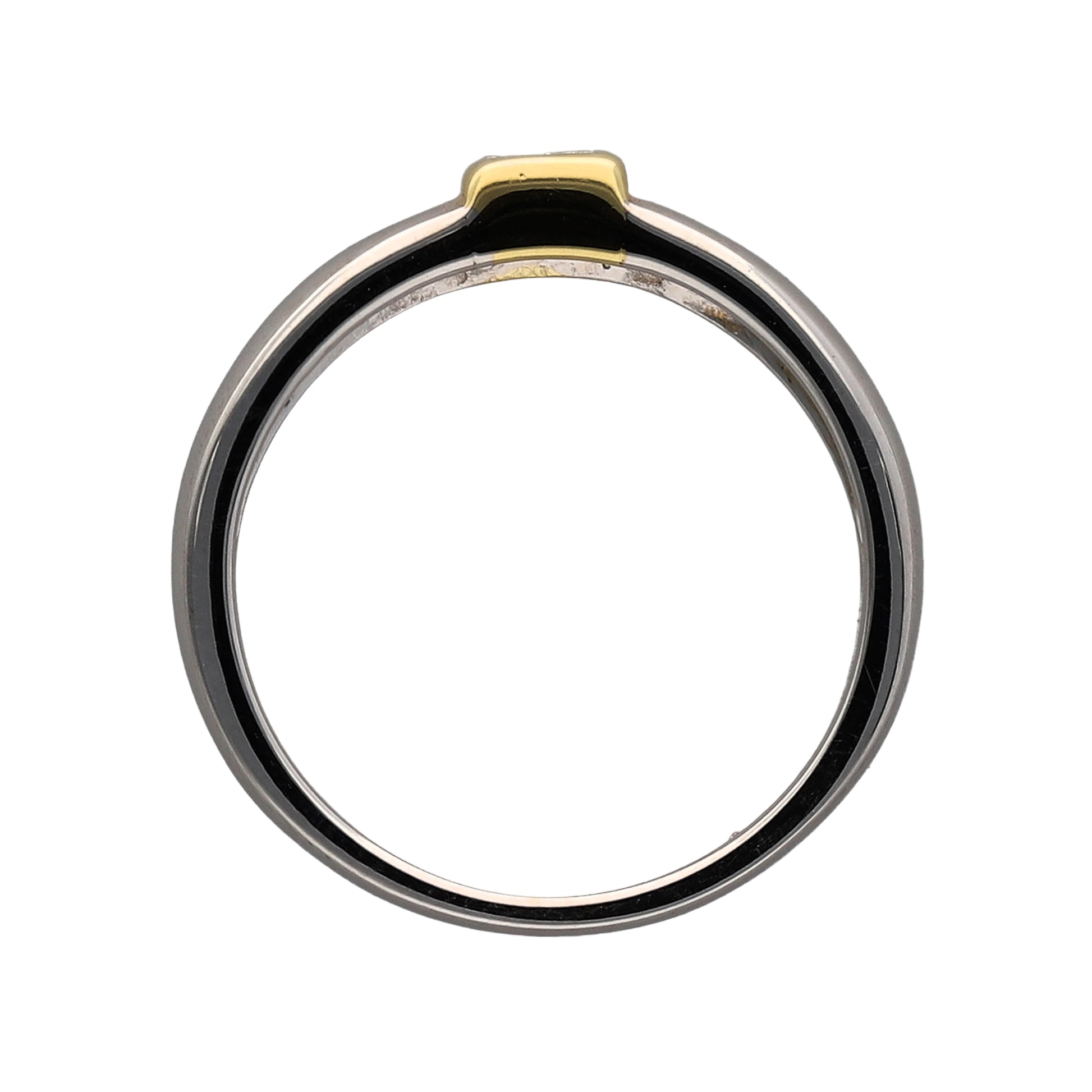 Preowned 18ct Yellow and White Gold & Diamond Illusion Set Solitaire Ring in size L with the weight 3 grams. The ring is made up of four interlocking princess cut Diamonds to form one larger stone which is approximately 14pt of Diamond content in total