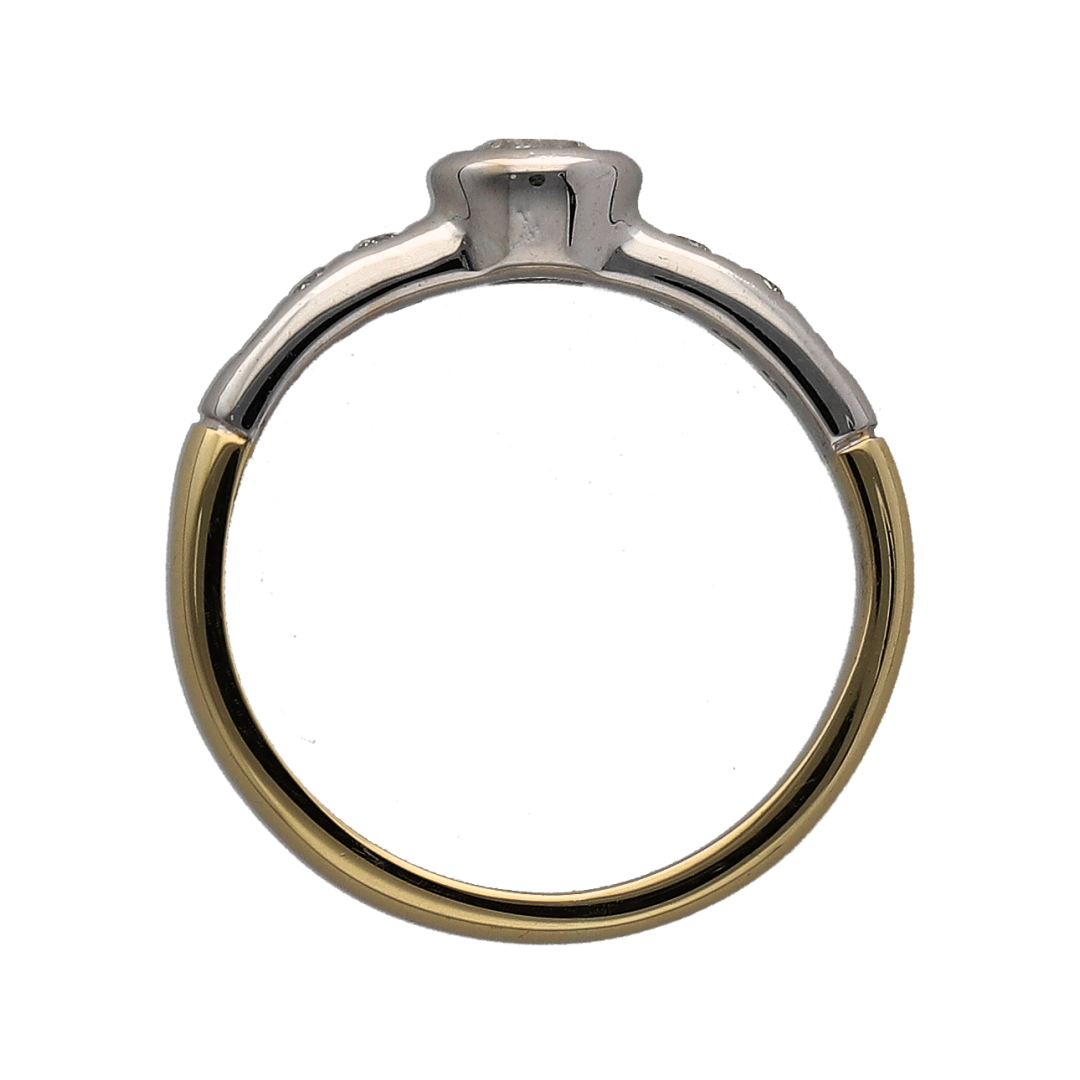 Preowned 18ct Yellow and White Gold & Diamond Rubover Set Solitaire Ring in size I with the weight 3 grams. The diamond is approximately 0.33ct and in addition the shoulders are diamond set