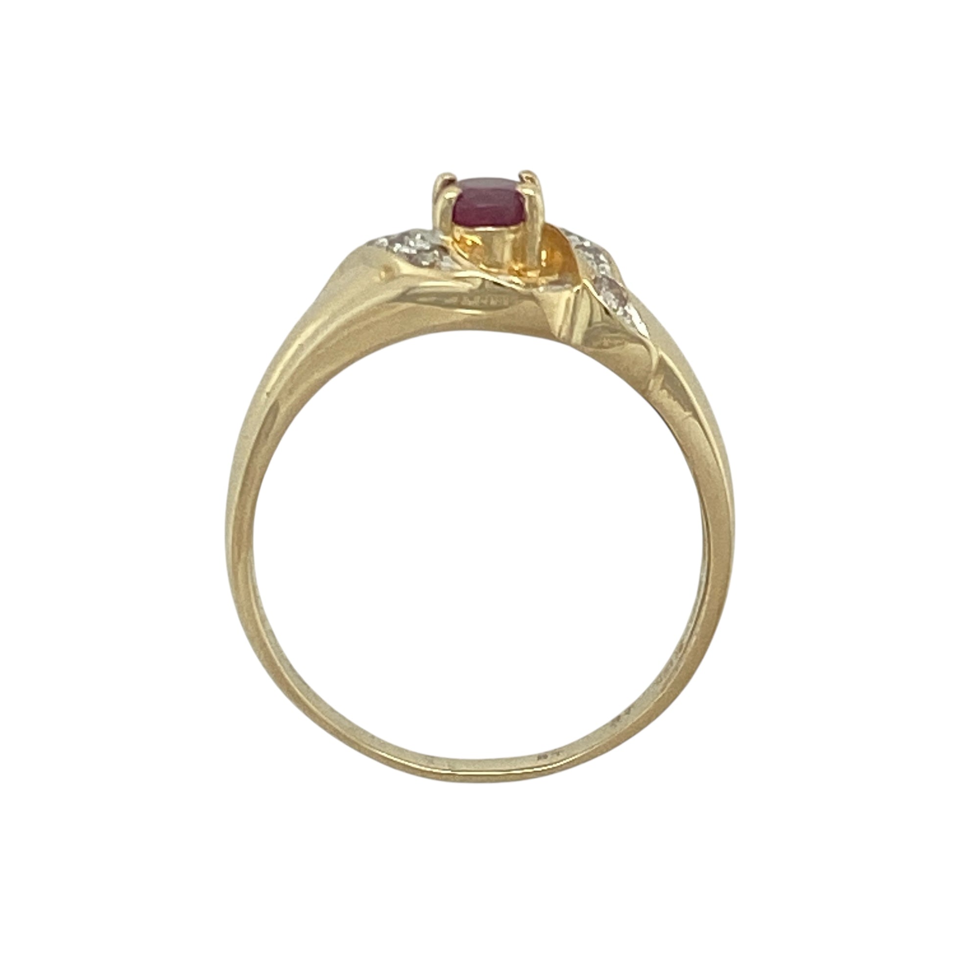 Design: The ring features a 5mm by 4mm oval ruby embraced by a graceful swirl of polished gold, accented with brilliant-cut diamonds for added shimmer and sophistication.