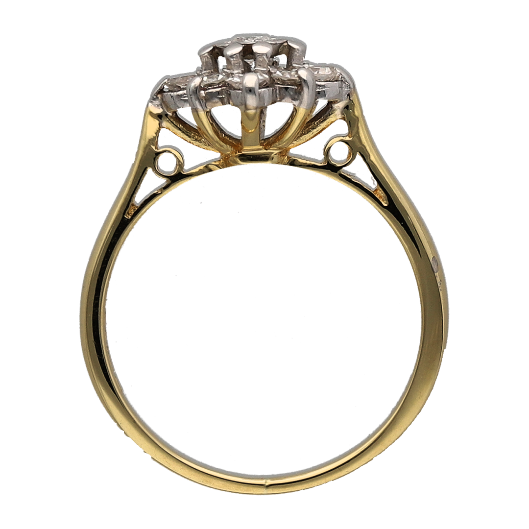 Preowned 18ct Yellow and White Gold & Diamond Set Flower Cluster Ring in size K with the weight 2.90 grams. The front of the ring is 11mm high