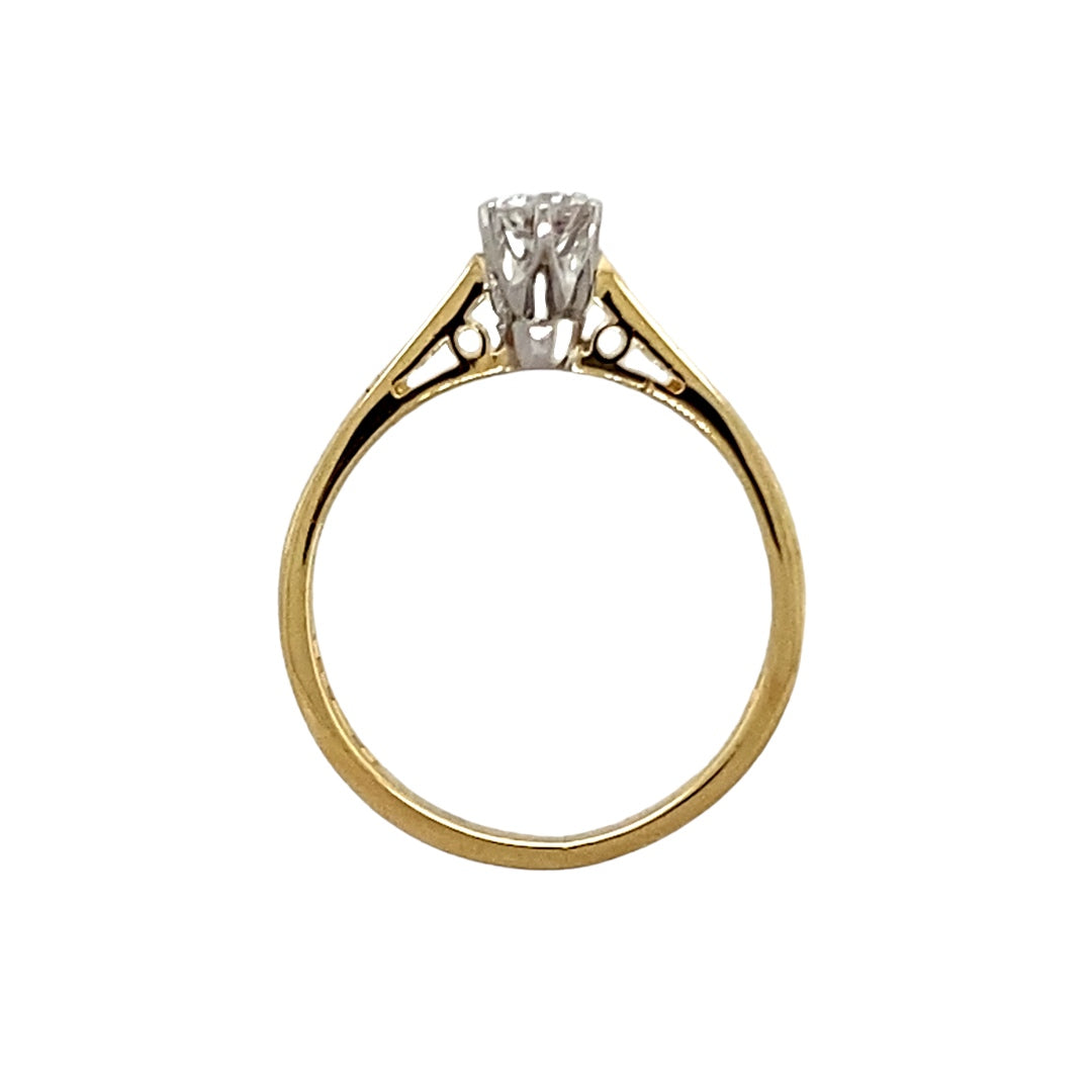 Preowned 18ct Yellow and White Gold & Diamond Set Solitaire Ring in size L with the weight 2.40 grams. The Diamond is approximately 25pt with clarity Si1 and colour K - M