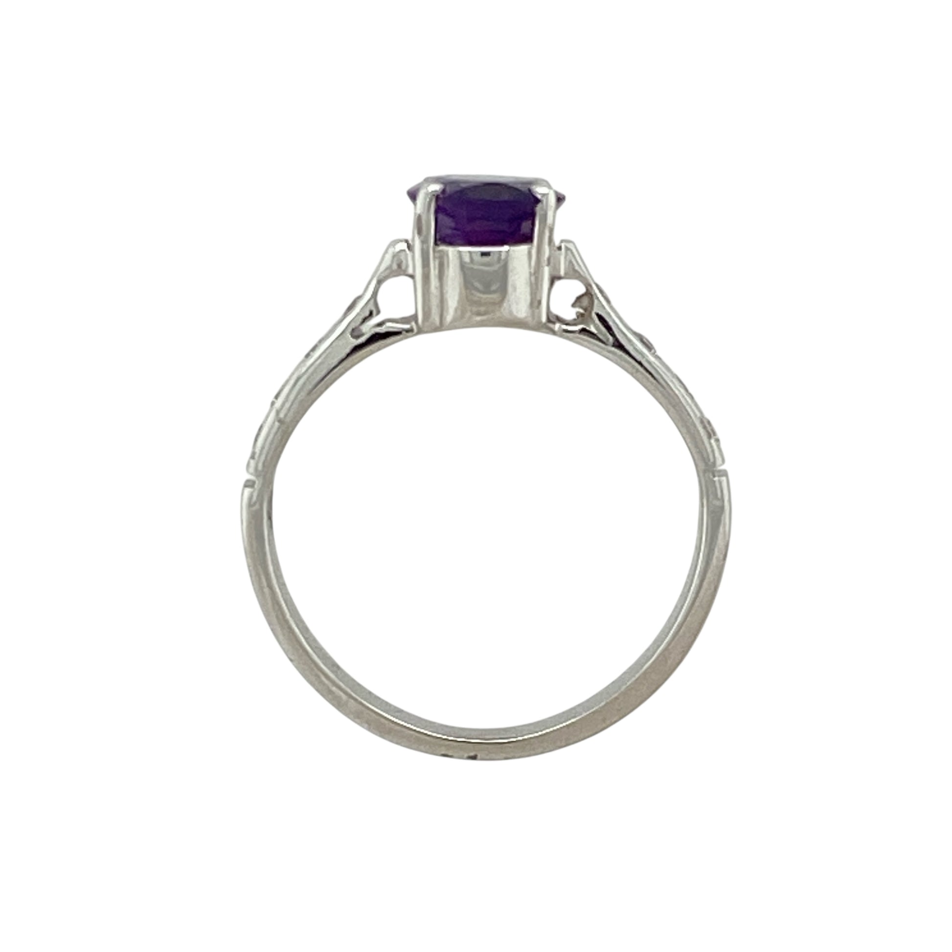 Design: The ring features an 8mm by 6mm oval amethyst at the centre, complemented by diamonds set along the shoulders for added brilliance.