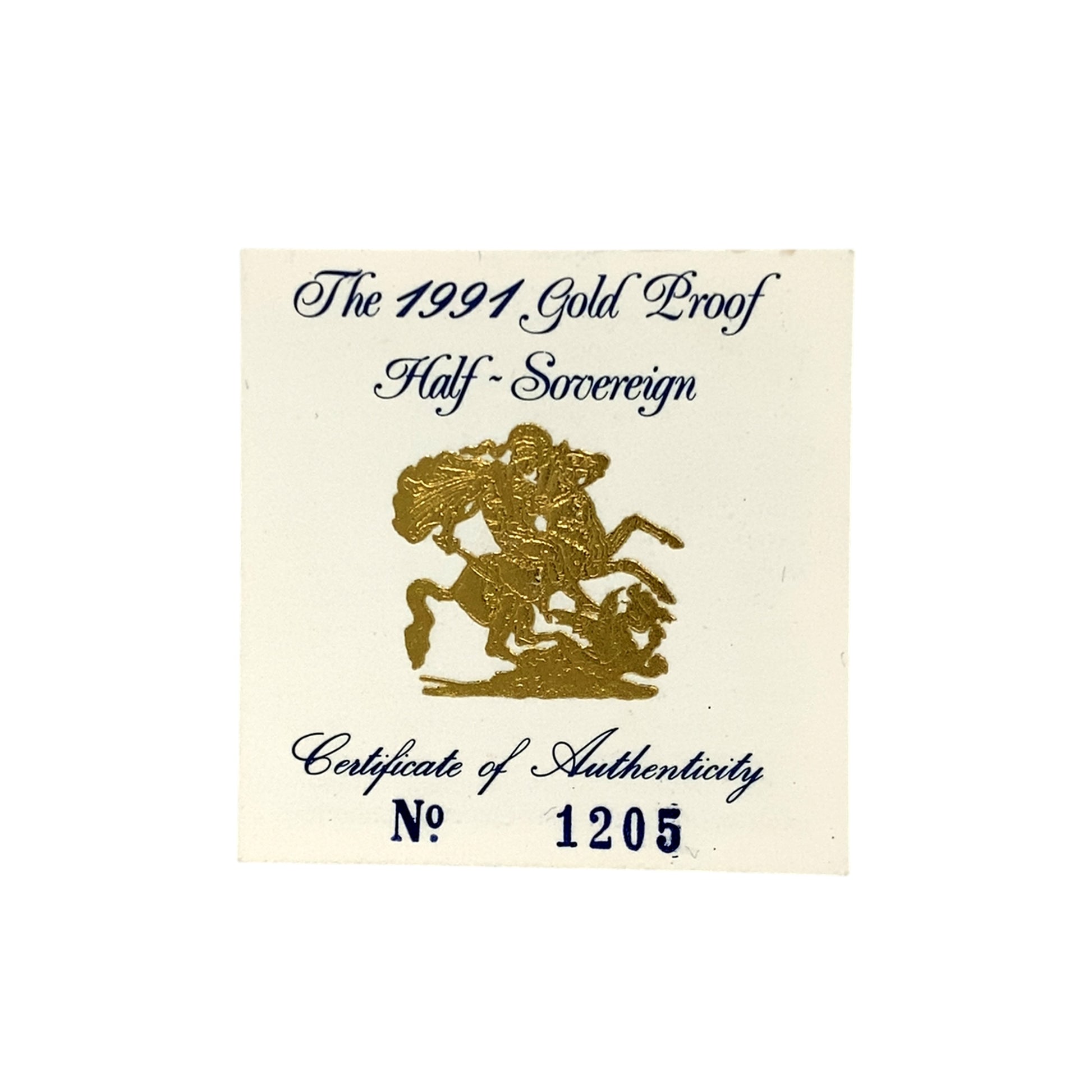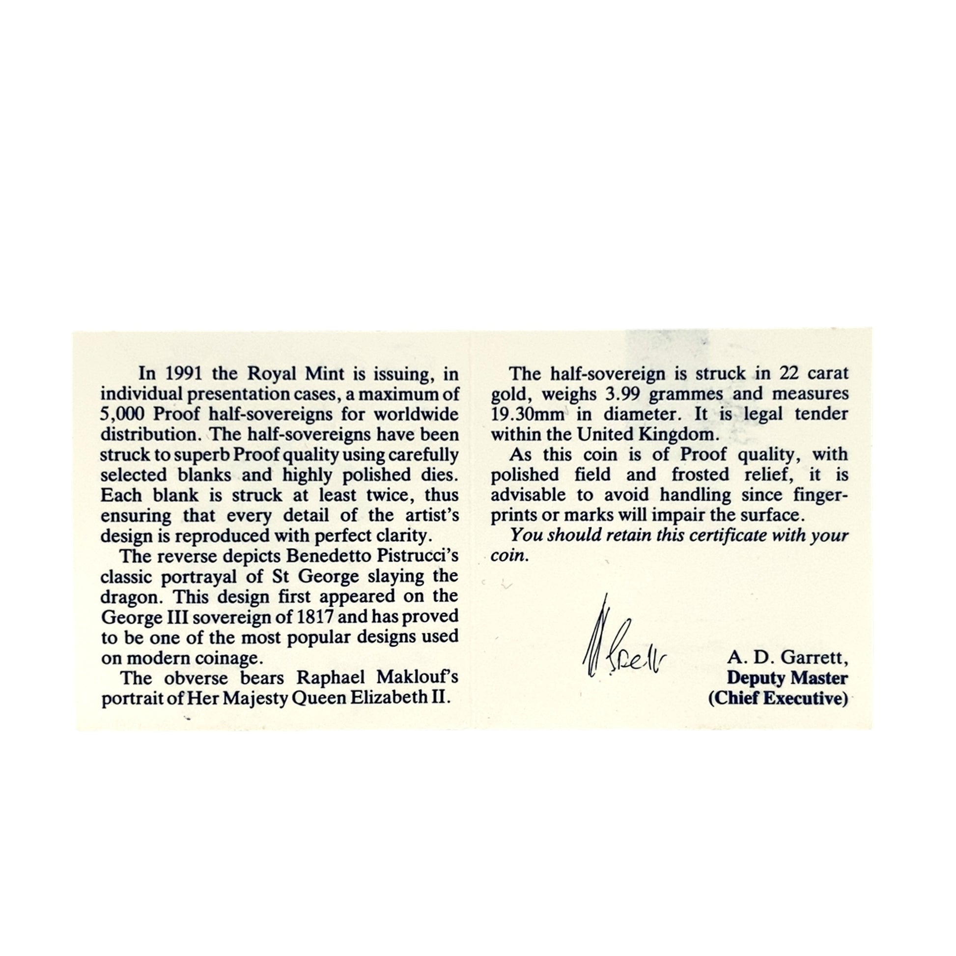 A 1991 Queen Elizabeth II 22ct Gold Boxed Half Sovereign with a George and the Dragon reverse. Just 3,588 proof Half Sovereigns were issued in 1991, making this among the lowest mintage Half Sovereigns
