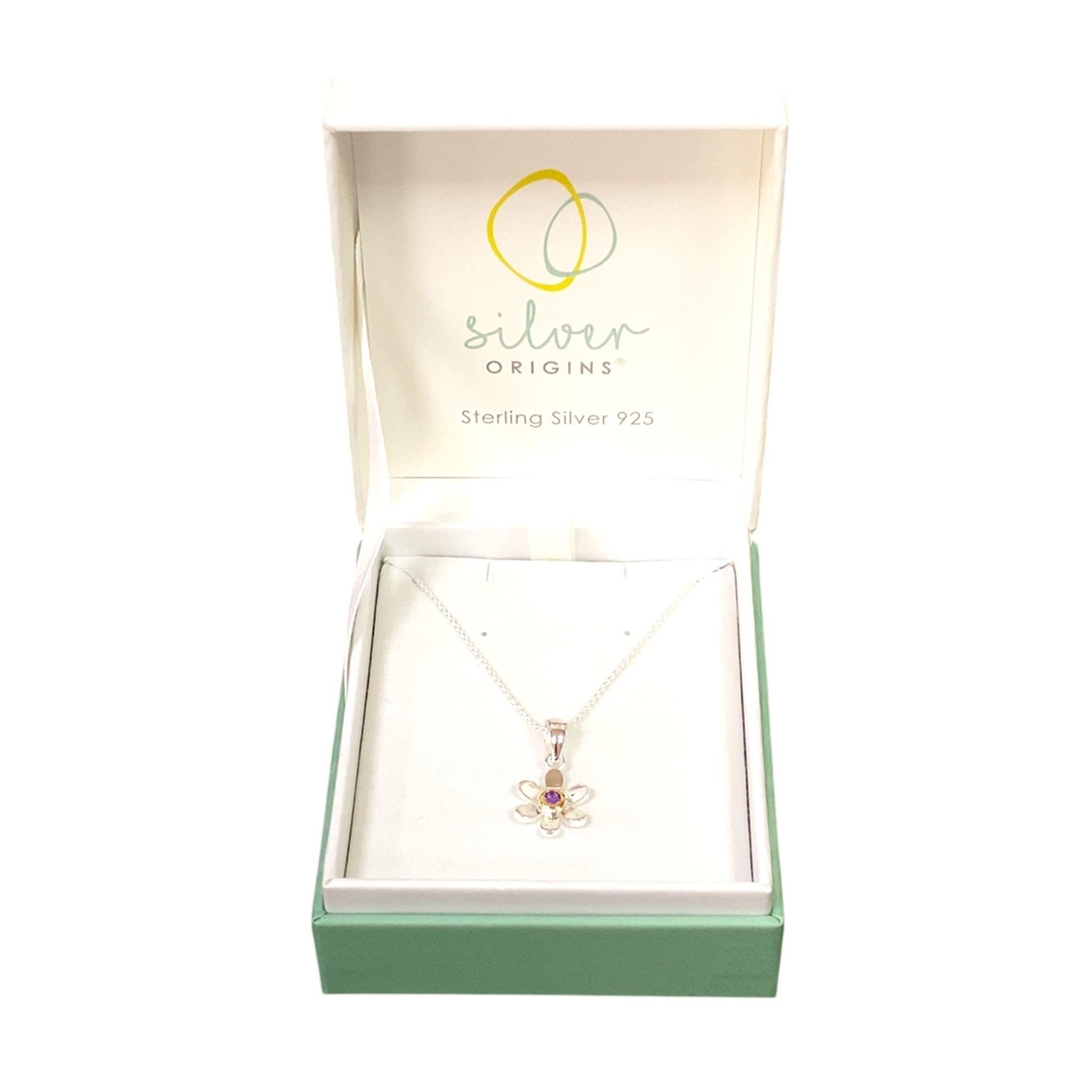 - Design: A delicate flower-shaped pendant, set with a stunning amethyst birthstone at its centre for a timeless and meaningful touch.