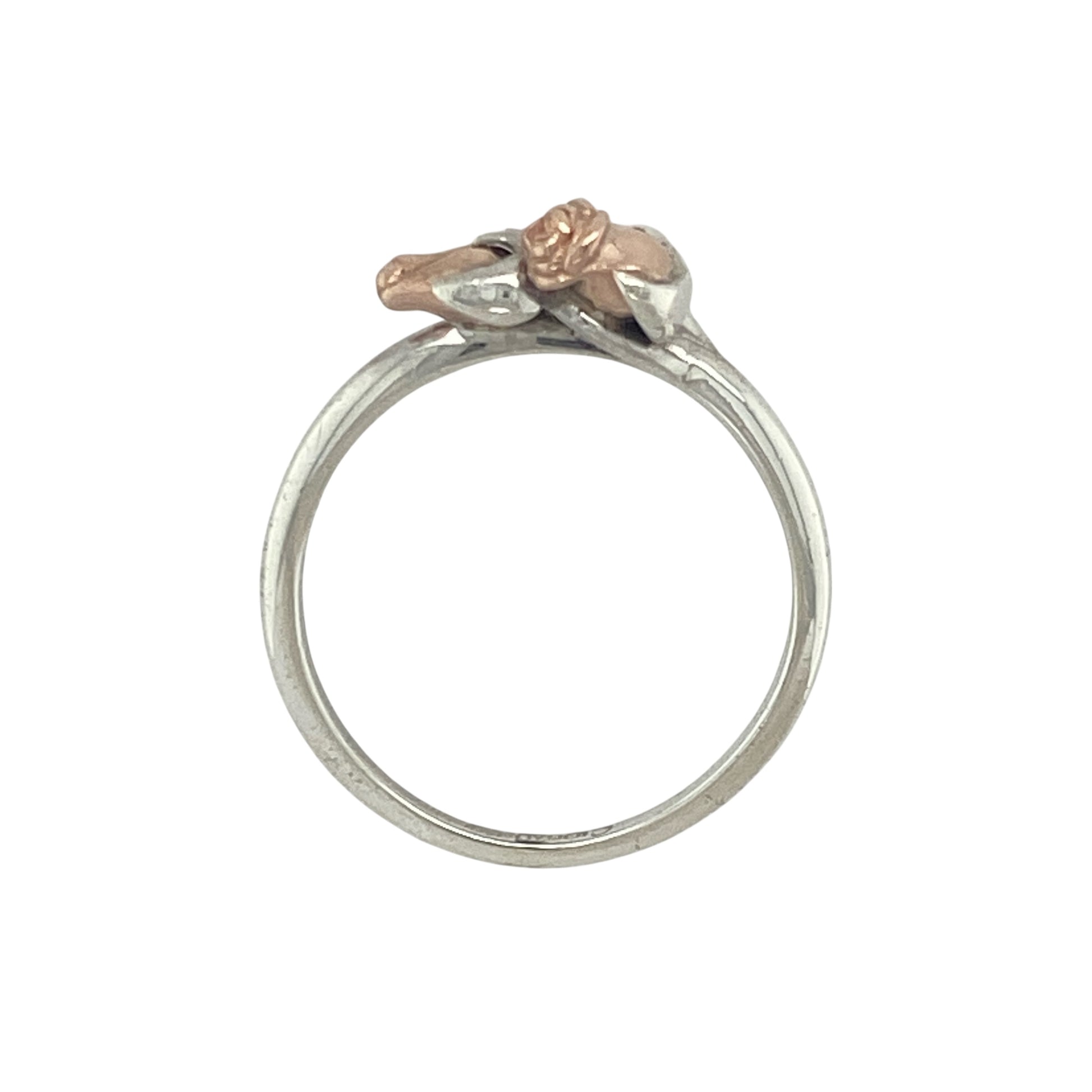 Bring romantic charm and symbolic beauty to your collection with this pre-owned Clogau silver and 9ct rose gold Glyn Rhosyn rose flower ring—a meaningful design inspired by nature.