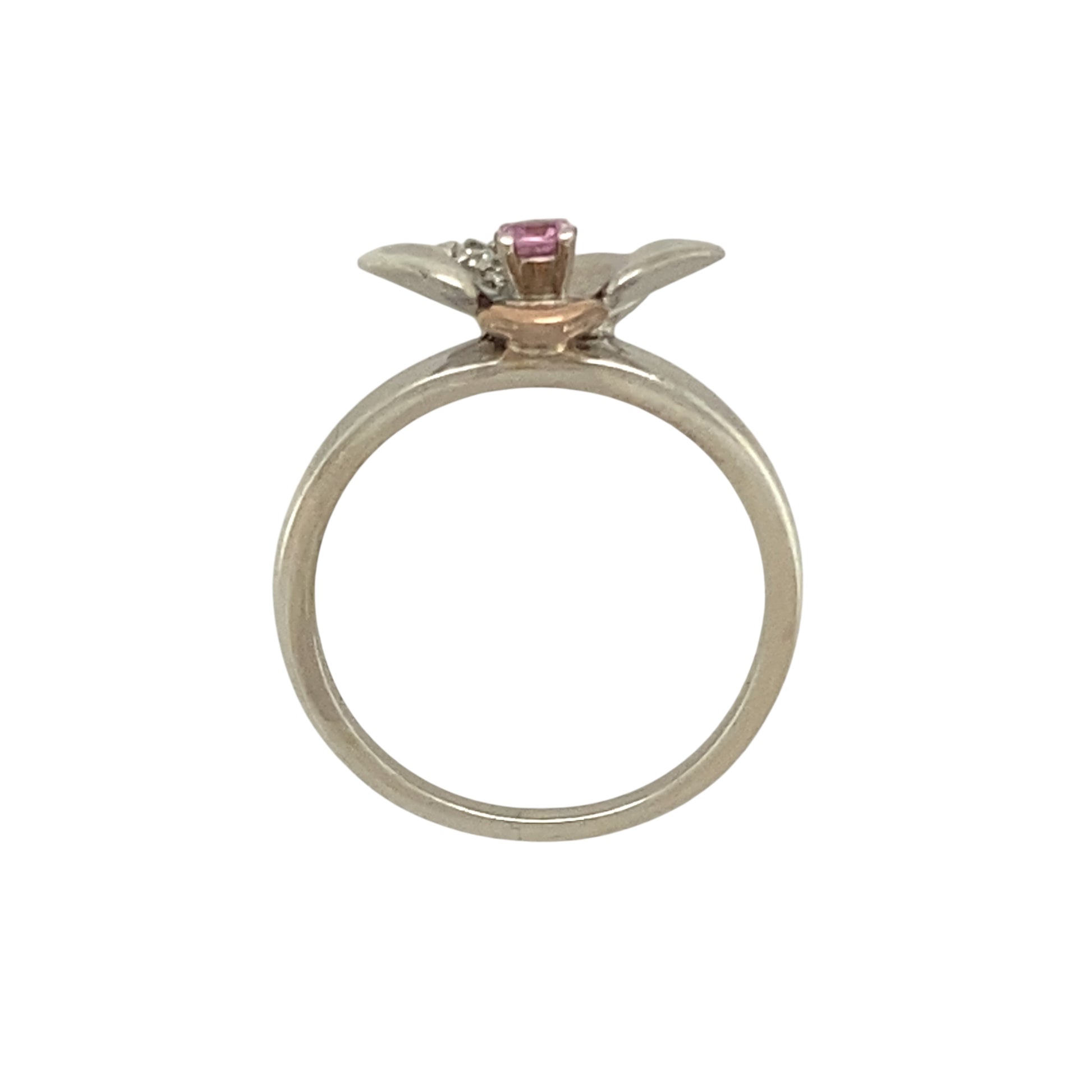 Preowned 925 Silver with 9ct Rose Gold & White and Pink Topaz Set Clogau Flower Ring in size L with the weight 3.20 grams. The front of the ring is 13mm high
