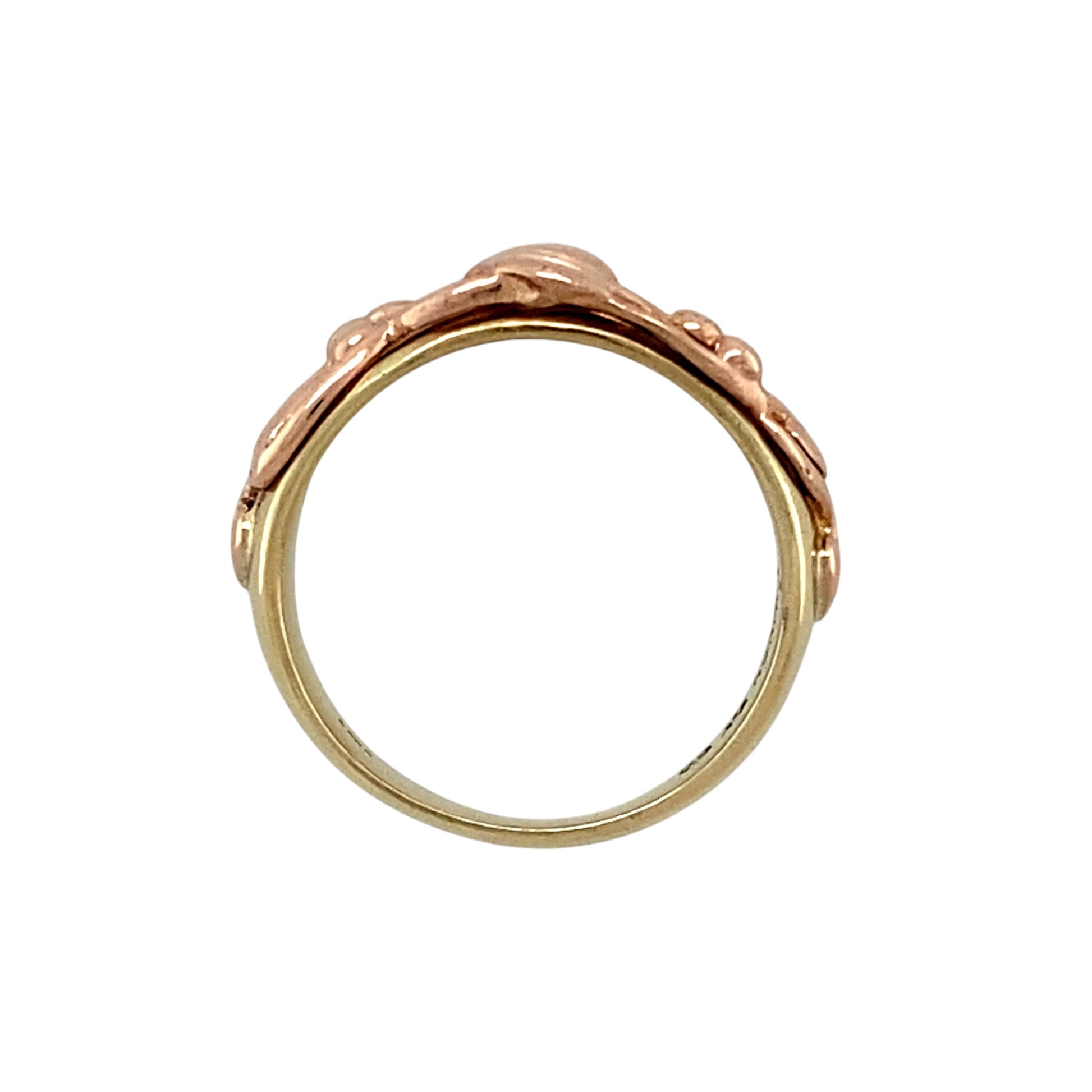 Preowned 9ct Yellow and Rose Gold Clogau Tree of Life Ring in size P with the weight 4.70 grams. The front of the ring is 8mm high