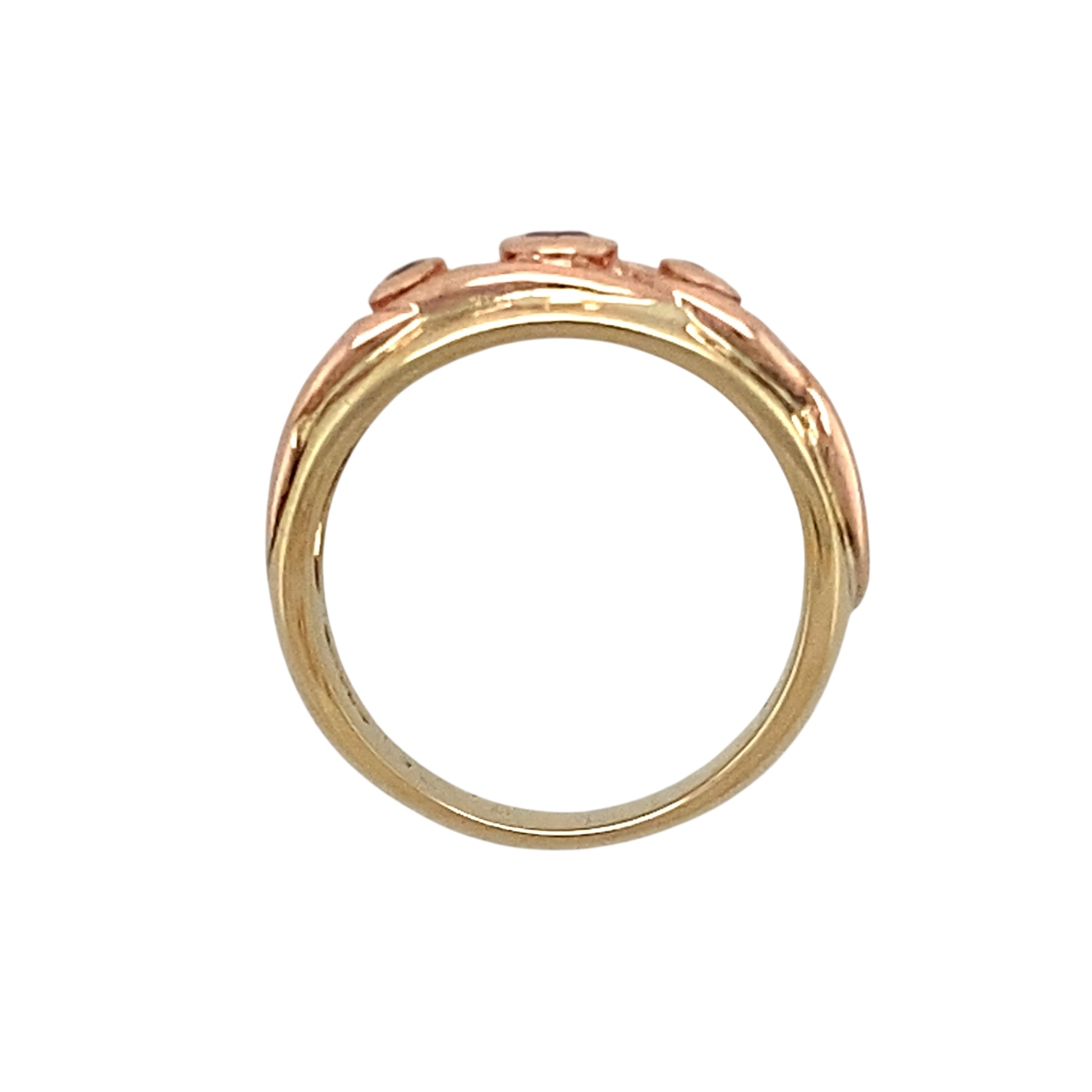 Preowned 9ct Yellow and Rose Gold Diamond & Pink Stone Set Clogau Celtic Ring in size K with the weight 4.60 grams. The front of the band is 8mm wide and the pink stone is 2mm diameter