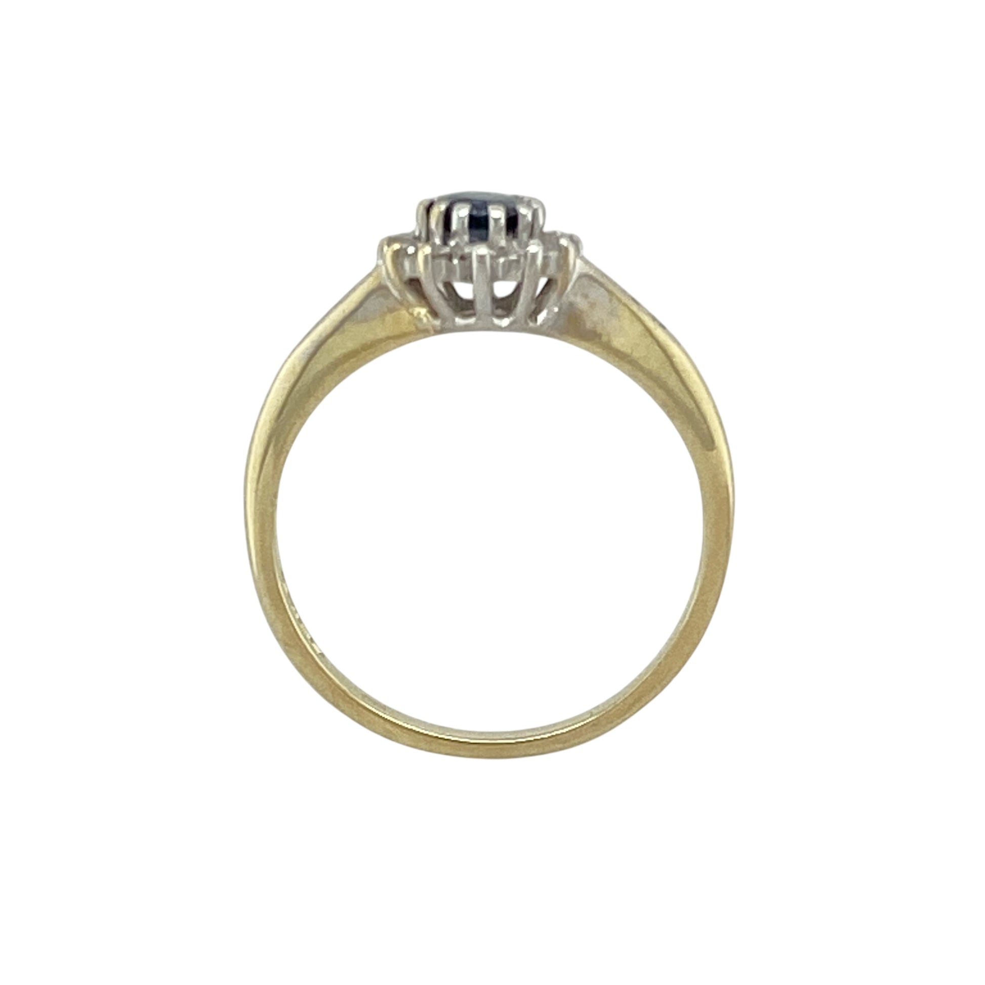Add timeless sophistication to your collection with this pre-owned 9ct yellow gold diamond and sapphire cluster ring, featuring: