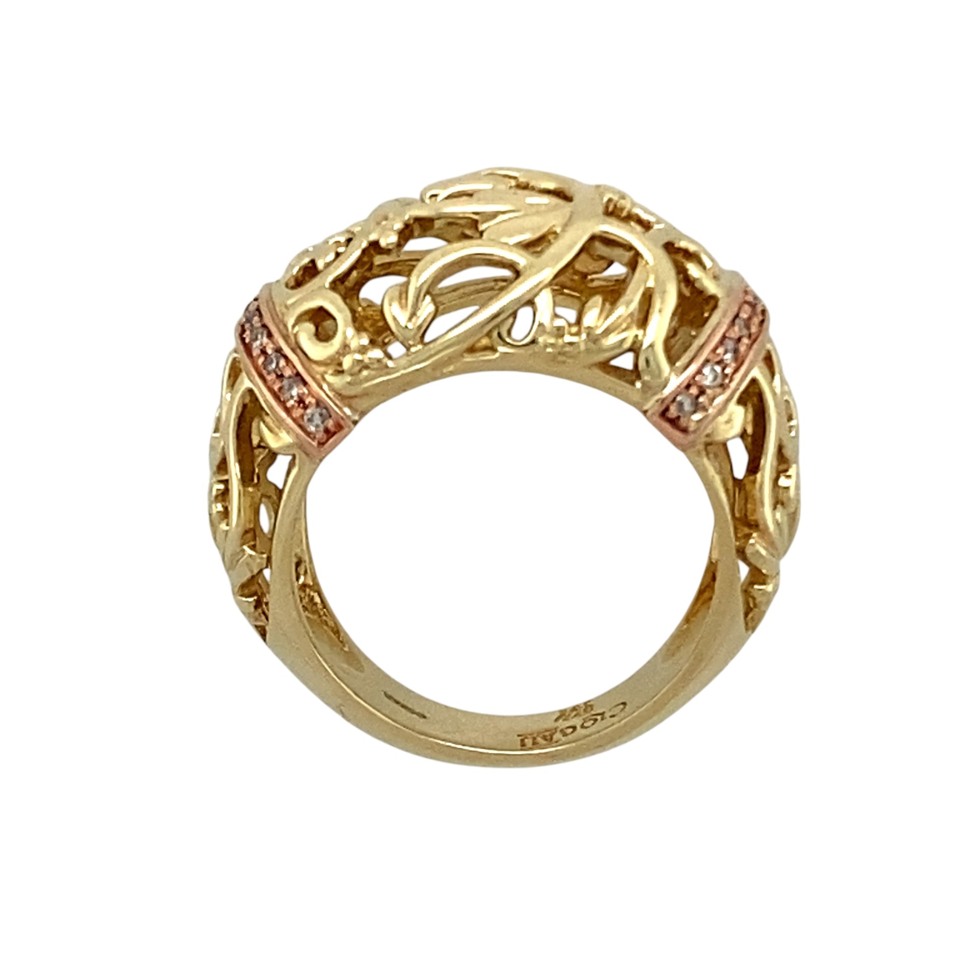 Preowned 9ct Yellow and Rose Gold & Diamond Set Clogau Set Rounded Vine Wide Band Ring in size K with the weight 8.50 grams. The front of the band is 14mm wide