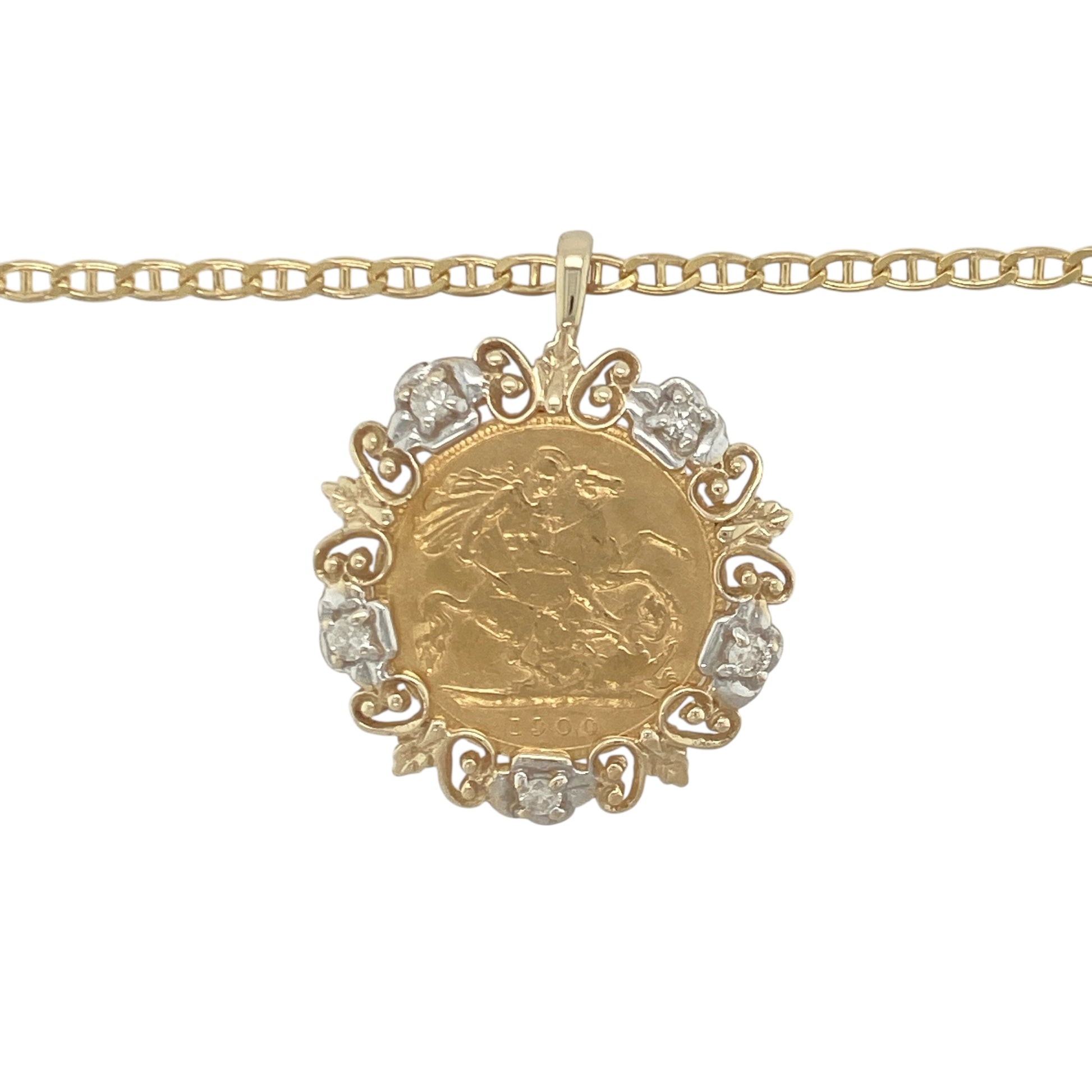 Design: The pendant measures 3.3cm in length including the bail and showcases a 22ct gold 1900 Old Veil Head Victoria half sovereign coin (London Mint), securely mounted within a 9ct yellow gold floral-inspired frame accented with sparkling diamonds.