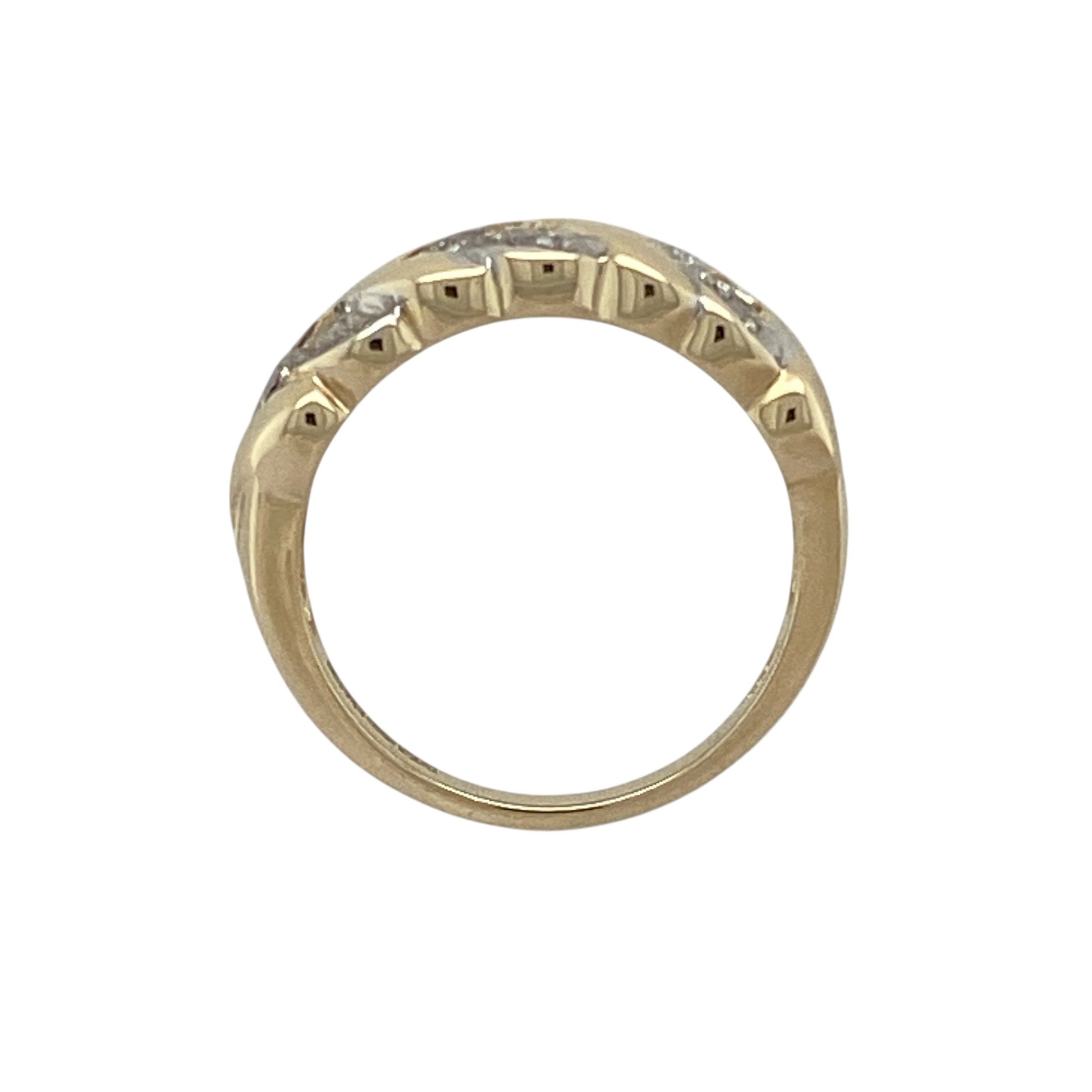 Bring subtle contrast and refined texture to your jewellery collection with this pre-owned 9ct yellow and white gold diamond plaited band ring—a distinctive piece with elegant curves and understated sparkle.