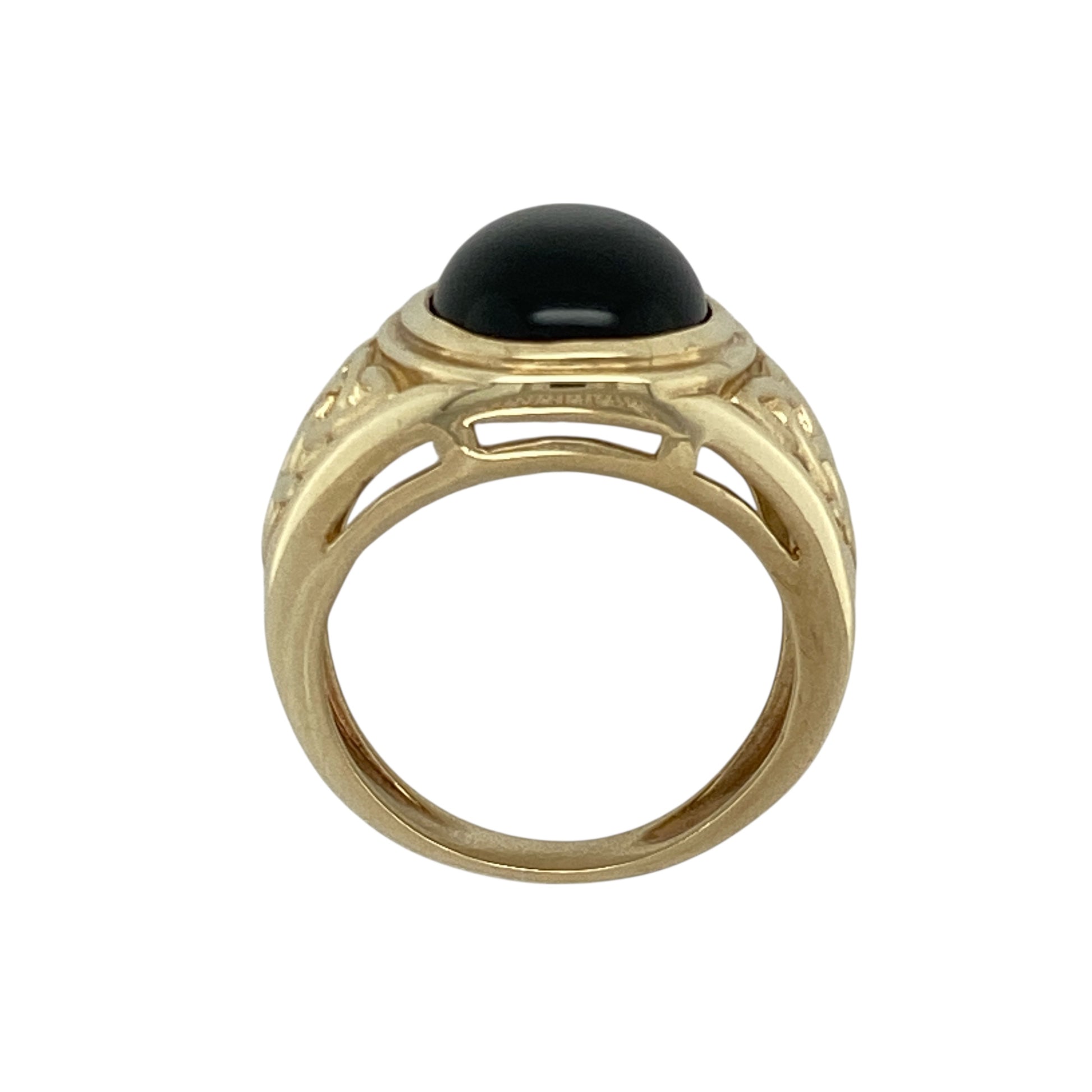 Material: Made from 9-carat yellow gold, the polished finish enhances the deep contrast of the black onyx and highlights the intricate knotwork.