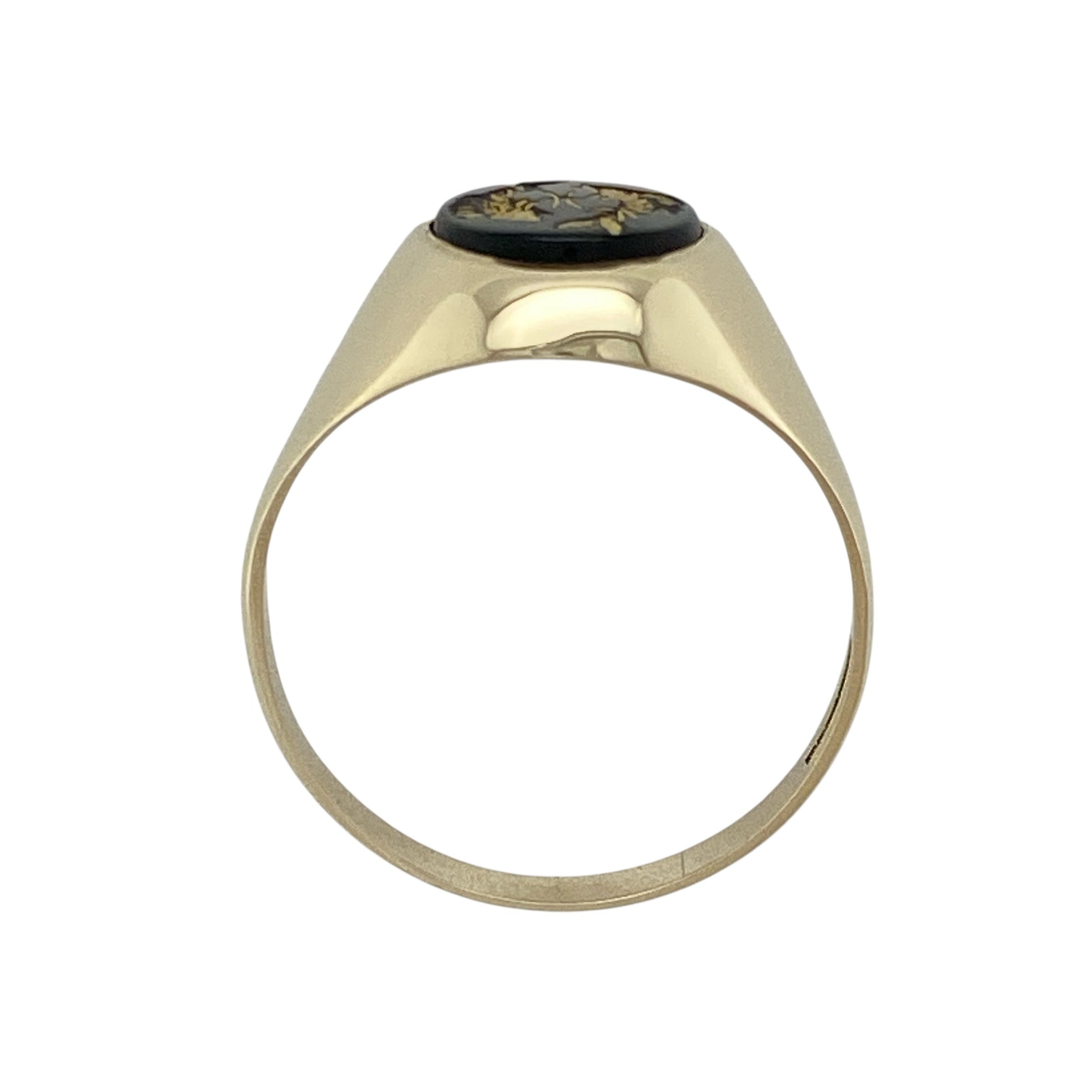Material: Made from 9-carat yellow gold, the polished finish enhances the rich contrast between the deep black onyx and the detailed gold inlay.
