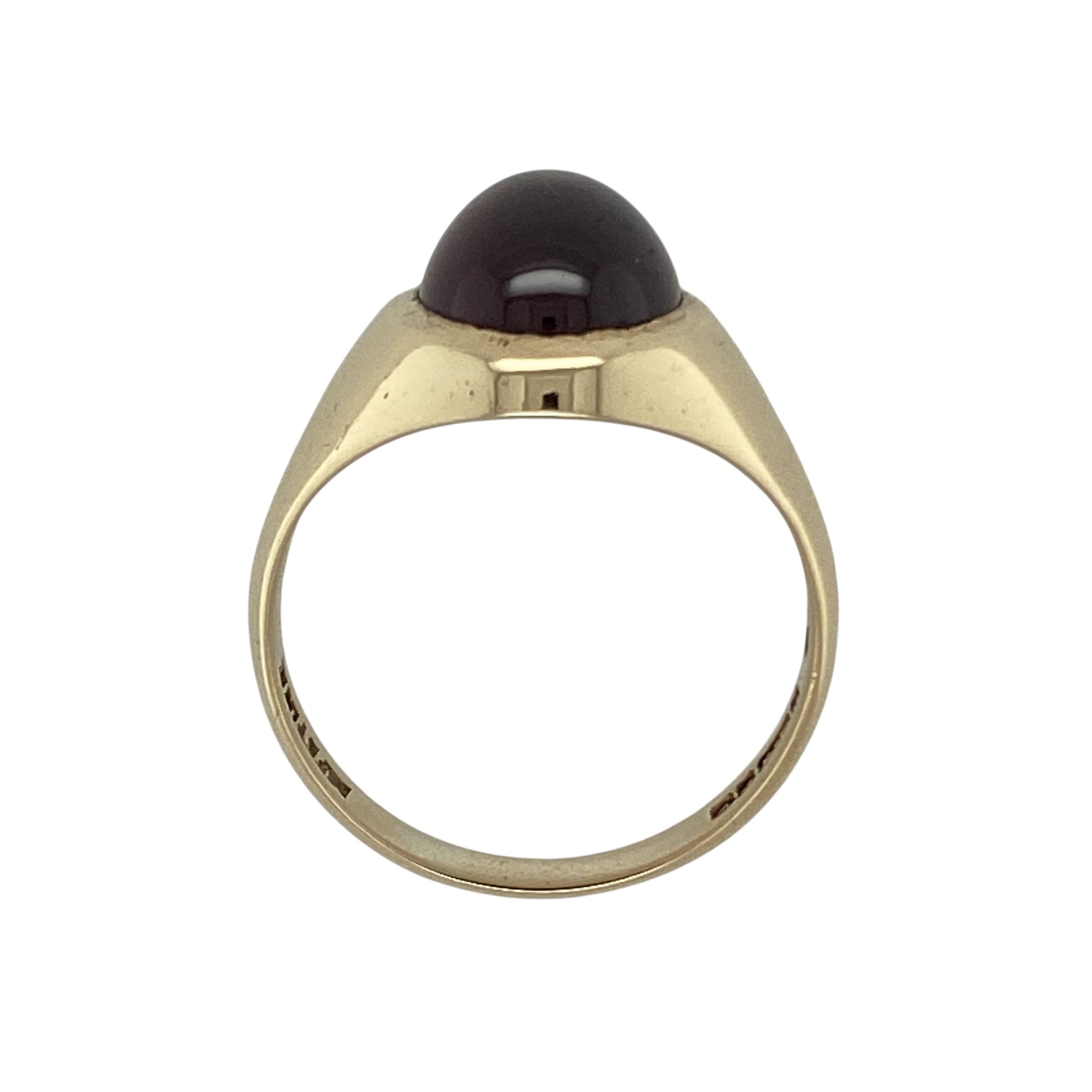 Bring rich colour and classic design to your collection with this pre-owned 9ct yellow gold red stone cabochon oval signet ring—a timeless piece that exudes elegance and character.