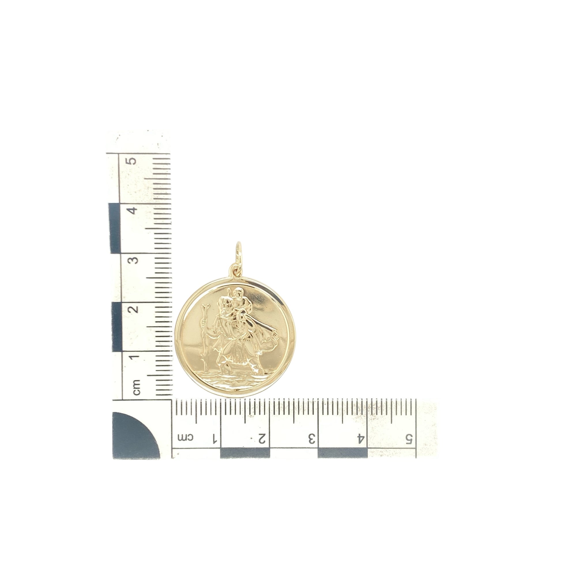 Design: The pendant features a detailed depiction of St Christopher carrying the Christ child, framed within a large round border that enhances its traditional style.