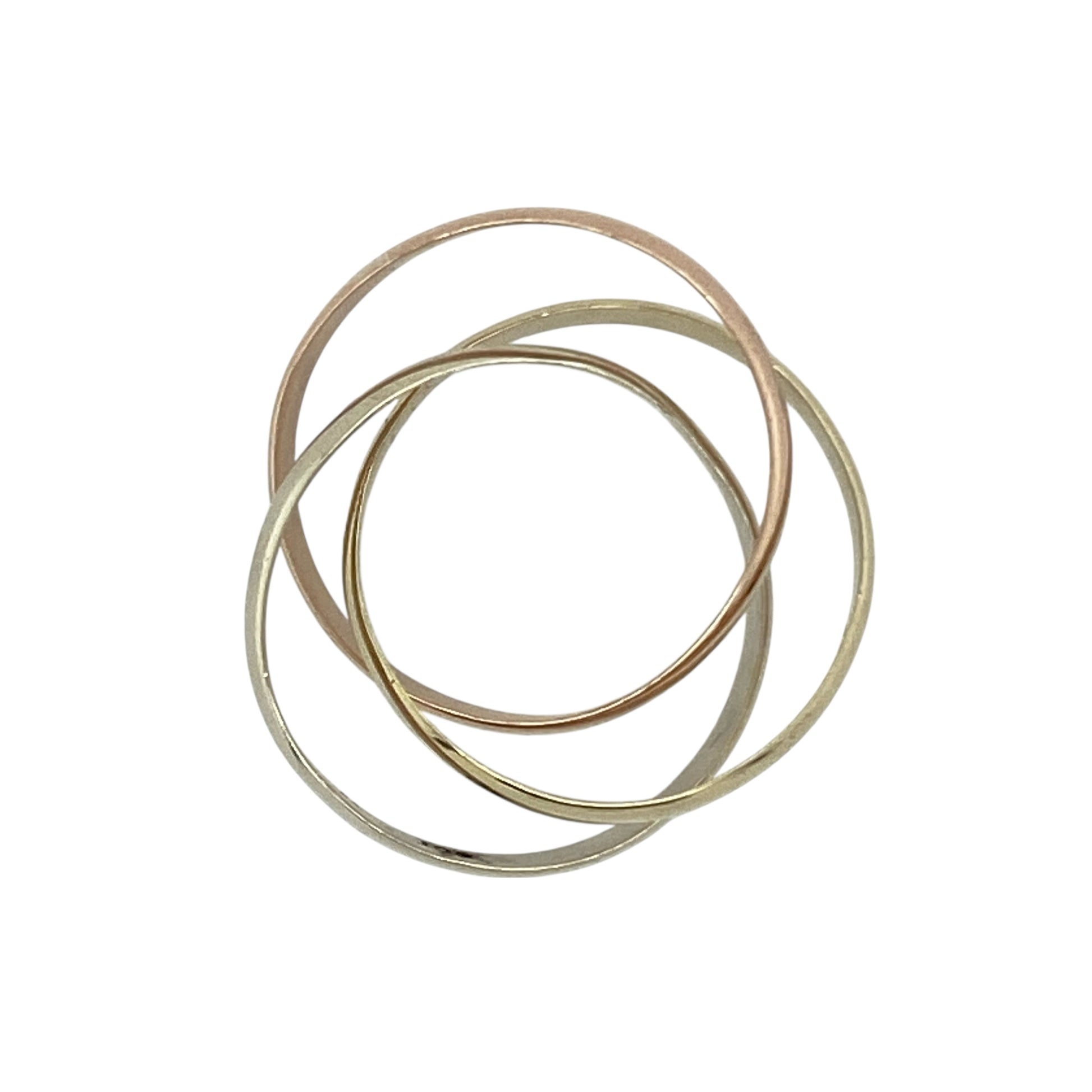 Design: The ring features three interwoven bands in yellow, rose, and white gold, creating a flowing twist design that represents connection and balance. Each band measures 3mm wide, with the combined width sitting at approximately 6mm for a graceful, layered look.