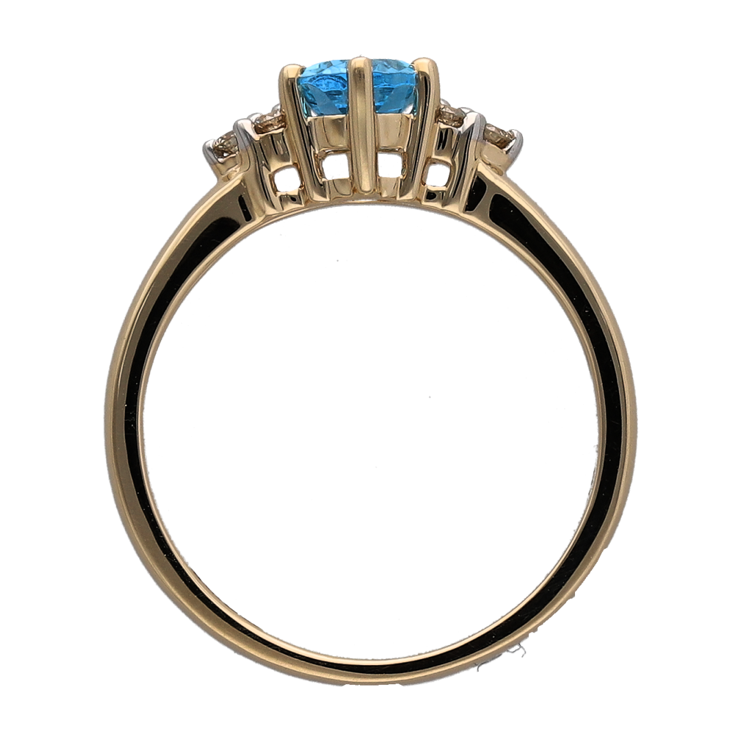 Design: The ring features a striking oval blue topaz stone measuring 7mm by 5mm at the centre, accented by three small diamonds on each side, with approximately 0.11ct of total diamond content, creating a bright and captivating focal point.