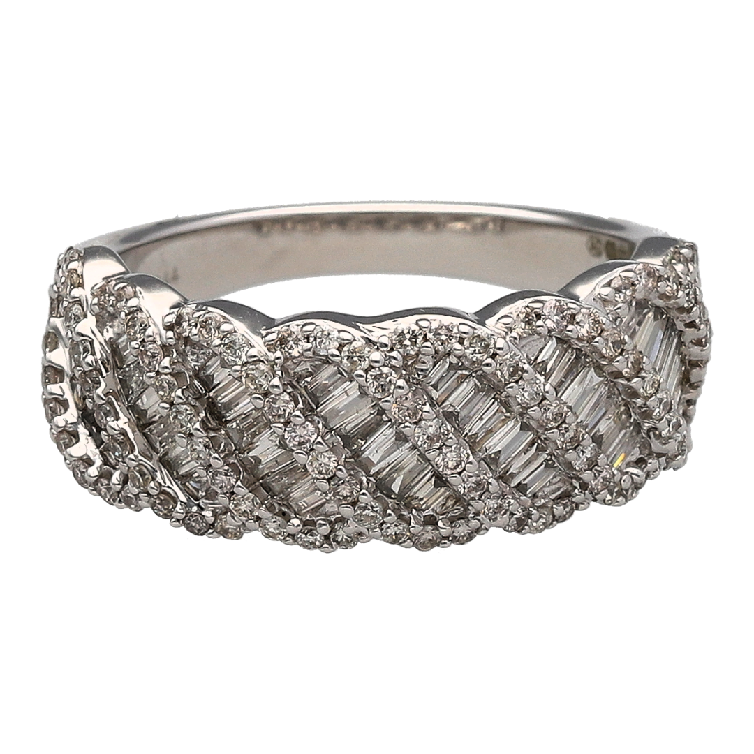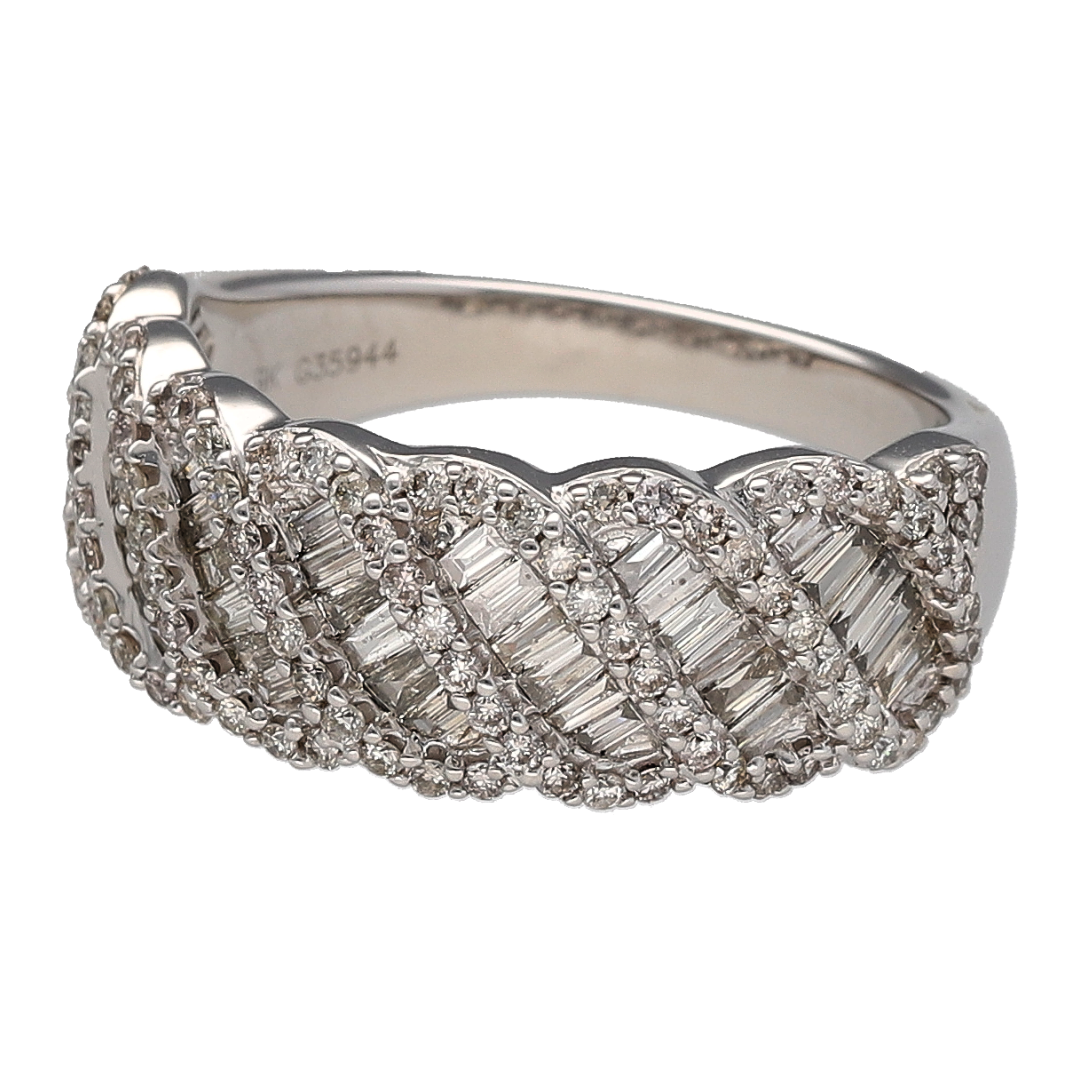 Design: The 9mm wide front of the band features an eye-catching wave pattern, set with a mix of brilliant and baguette cut diamonds for dynamic sparkle and dimension.