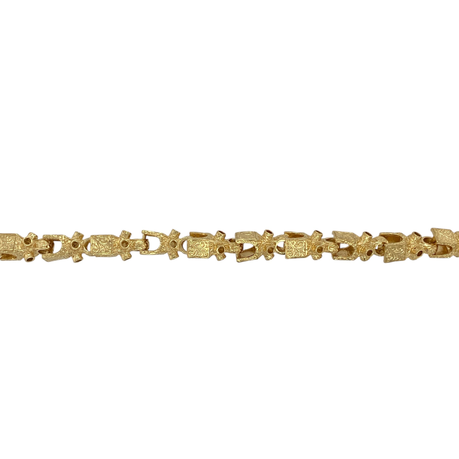 Design: Featuring 7mm wide rectangular Lego-style links with detailed engraved patterning, this bracelet offers a contemporary look with refined texture.
