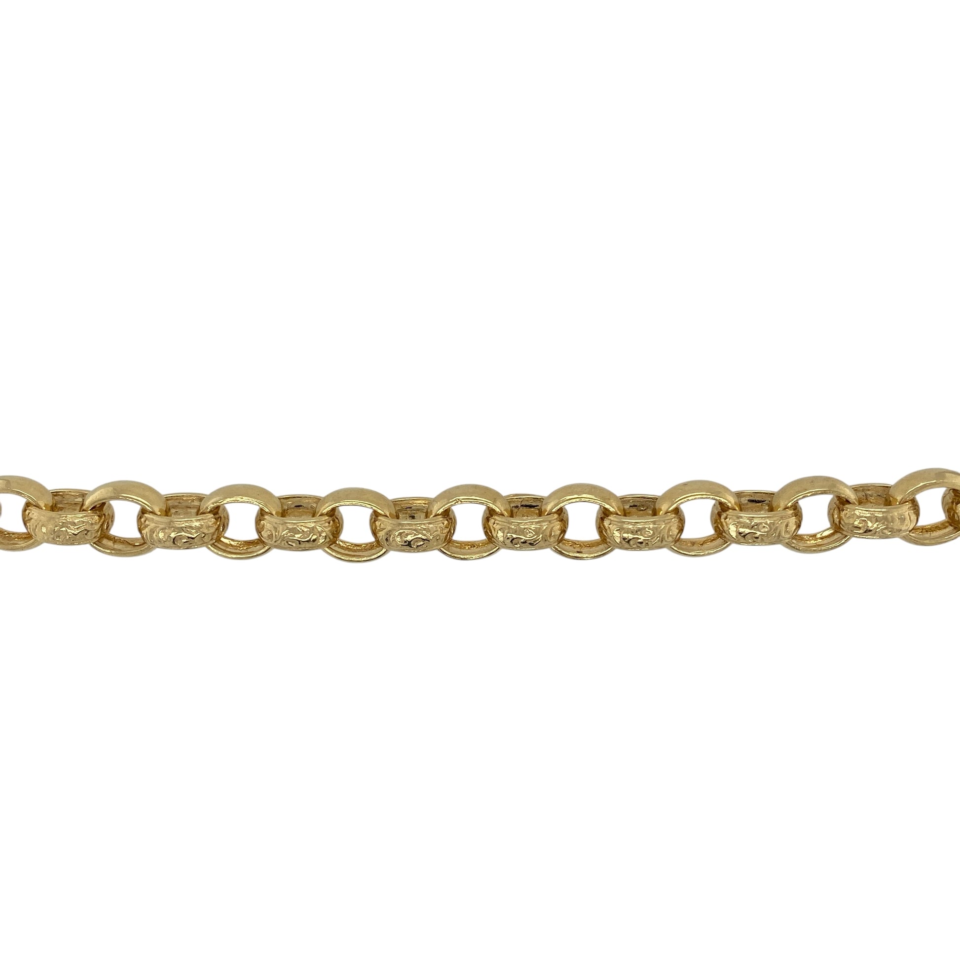 Design: Featuring 11mm wide oval belcher links with intricate engraved patterning, this bracelet offers traditional design elevated by warm, golden tones.